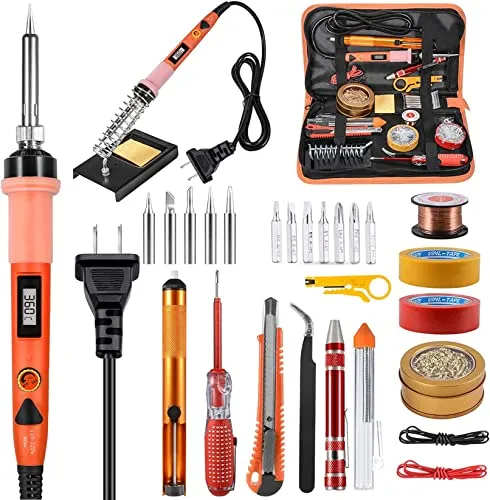 【21in1はんだごてセット】はんだごて、はんだごてポンプ、はんだごてチップ5個、ブリキパイプ、ドライバー、はんだごてホルダー、ピンセット、吸引スポンジ、ワイヤーストリッパー、テスター、壁紙ナイフ、クリーニング、テープ、金線、線2本とPUハンドバッグ。赤いPUバッグのデザインはスタイリッシュなので、持ち運びに便利で、ハンドバッグに必要なツールを見つけることができます。初心者、溶接工、基本的な家庭用機器、溶接技術者のトレーニングに最適です。