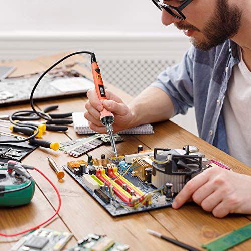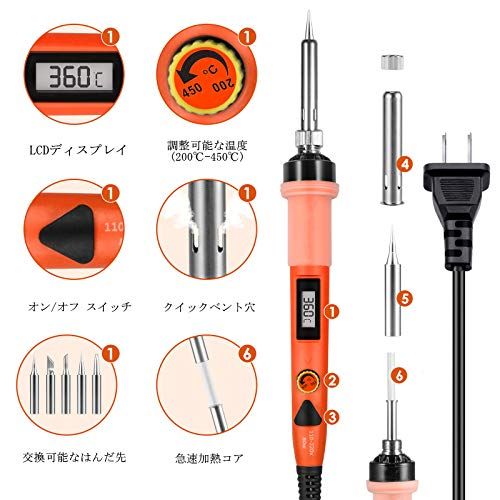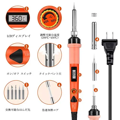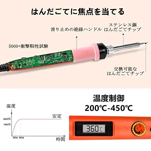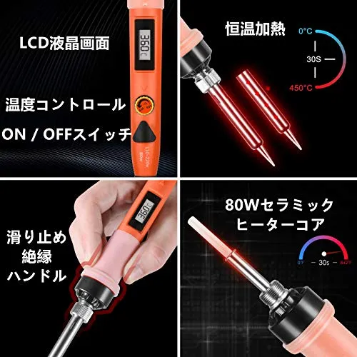 【簡単な温度調節】80Wはんだごてセット、液晶ディスプレイ、つまみ付き温度調節(200~450)。同時に、はんだごては、高温耐性のある材料を使用して、高精度と一定温度を保証することができます。溶接ヘッドはしっかりと支えられ、脱落しにくいです。溶接プロジェクトのすべての要件を満たします。