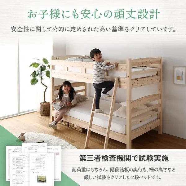 商品名:2段ベッド シングル 薄型 3つ折りポケットコイルマットレス付き 檜 ひのき ヒノキ すのこ 木製 分割 連結 日本製フレーム