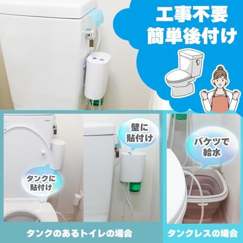 【工事不要で簡単後付け設置】 後付けトイレバブルクッション「あわらく」は工事不要です。 誰でも簡単に設置することができます。 タンクのあるトイレの場合は、タンクに給水チューブを入れます。 タンクレスのトイレの場合は、バケツなどに水をいれて使用してください。