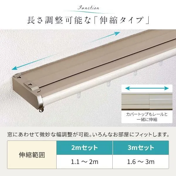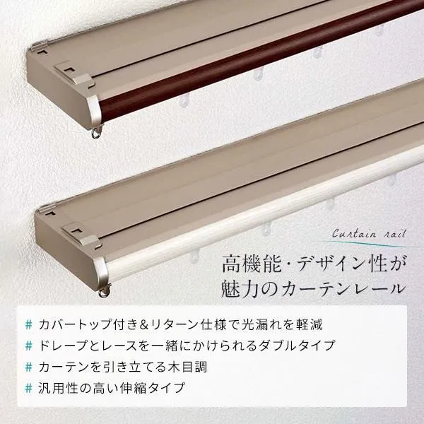 商品名:伸縮 カーテンレール 〔3m セット 木目ホワイト〕 カバートップ付き ダブル リターン仕様 リネアカバー 遮光 木目調 光漏れ防止