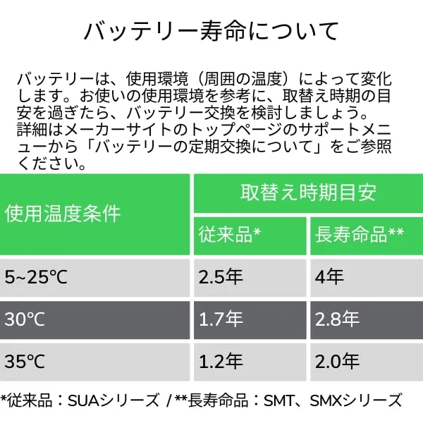 【バッテリ型番対応表:http://sturgeon.apcc.com/Kbase.nsf/ForExternal/FD31794C765F727D4925768100183AB2?OpenDocument】 「主な仕様」長いバッテリー寿命 ー インテリジェントバッテリーマネジメントシステムとの完全な互換性が得られるよう、APC UPS専用にシュナイダーエレクトリック、APCにより設計しております。