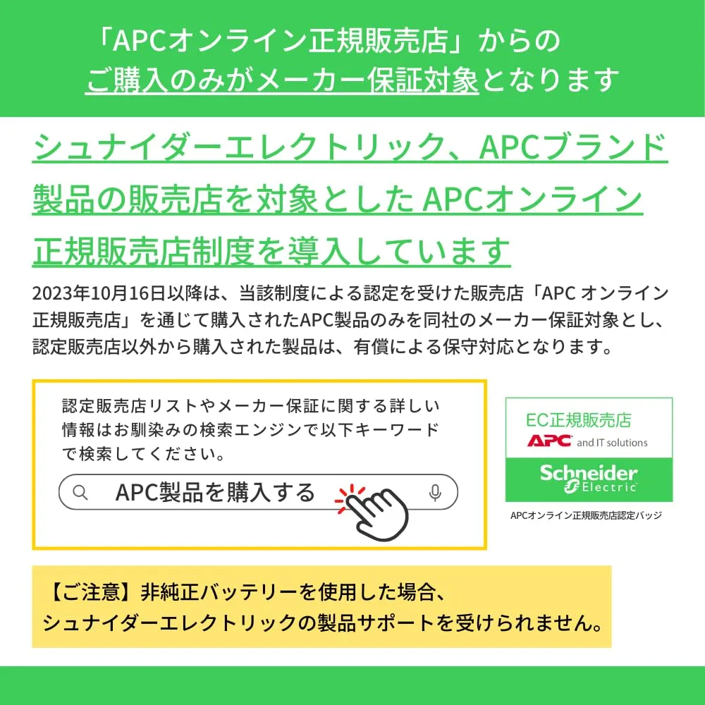 「商品状態」「商品情報 (新品の場合) 」交換用バッテリキットはお客様がお持ちのAPC製UPSのバッテリをお客様自身で交換できるバッテリキットです。交換用バッテリキットの無償保証期間は、お買い上げ日から1ヶ月です。※UPS本体のサポート期間は購入後5年間です5年以上経過したUPSについてはリプレイスをご検討ください。
