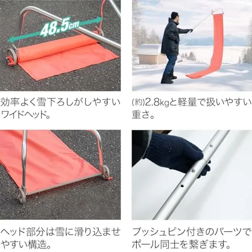 【幅(約)48.5cmのワイドな頭部 ワイドヘッドで作業効率UP!】 幅48.5cmのワイドヘッドで効率よく雪を下ろすことができます。また、ヘッドにはホイールが付いているので、屋根に当ててスムーズに雪を下ろせます。