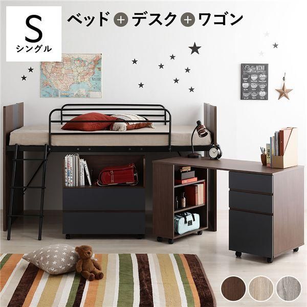 商品名:システムベッド 3点セット ベッド幅102cm ブラウン シングル ロフトベッド 学習机 デスクワゴン 子供部屋