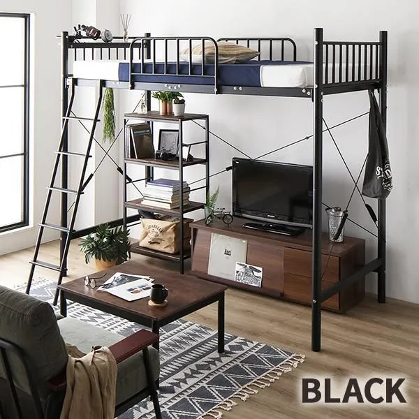 商品名:ロフトベッド シングル ベッド+デスク60cm+ラック ベッド:ブラック デスク&ラック:ウォールナット 2段階高さ調整可 頑丈 宮付き