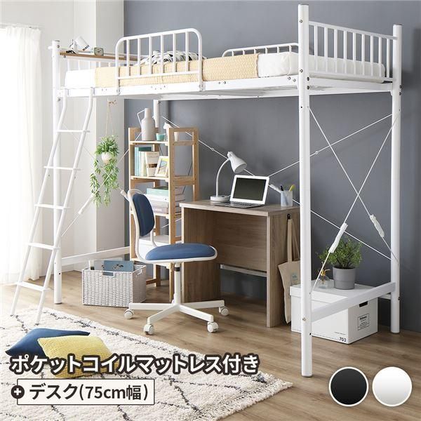 商品名:ロフトベッド シングル ベッド+デスク75cm ポケットコイルマットレス付き ベッド:ホワイト デスク:シャビーオーク