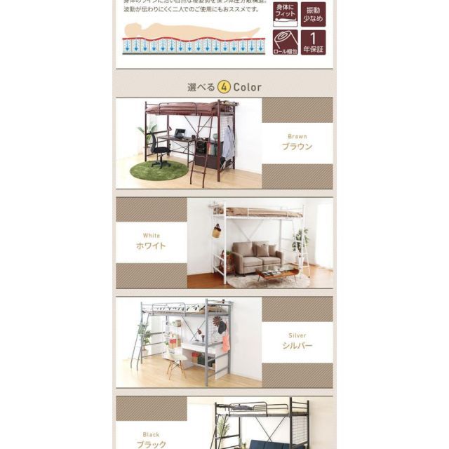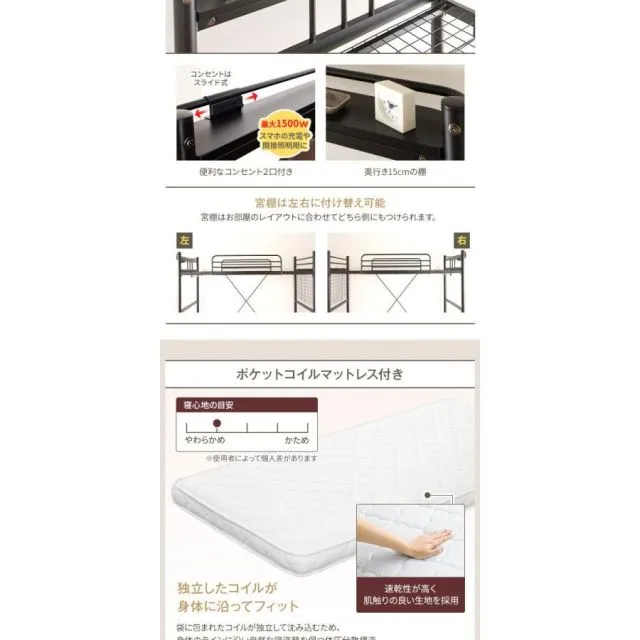 商品名:ロフトベッド シングル ポケットコイルマットレス付き ブラック 2段階高さ調整可 頑丈 コンセント付き はしご付き 宮付き 棚付き