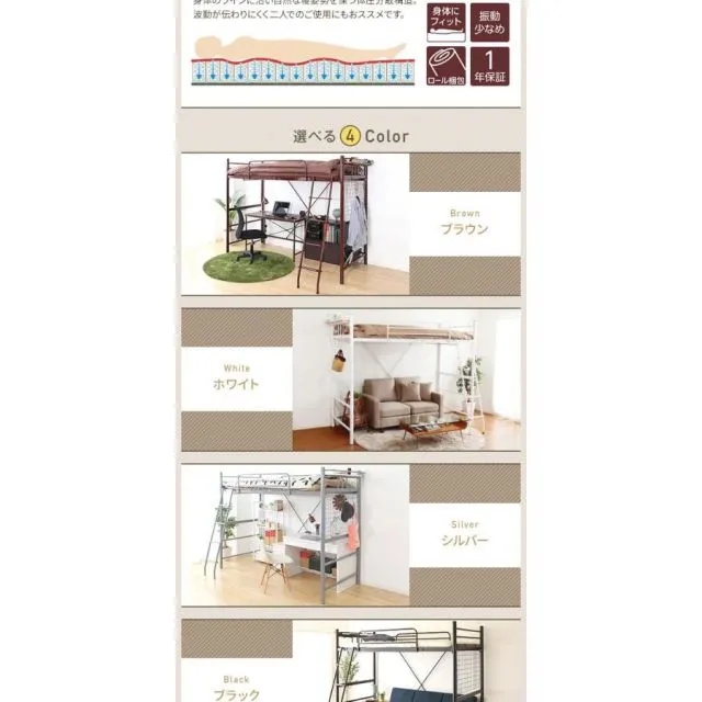 商品名:ロフトベッド シングル ポケットコイルマットレス付き シルバー 2段階高さ調整可 頑丈 コンセント付き はしご付き 宮付き 棚付き