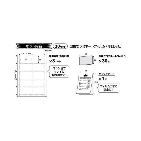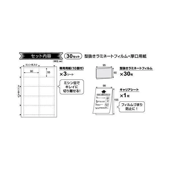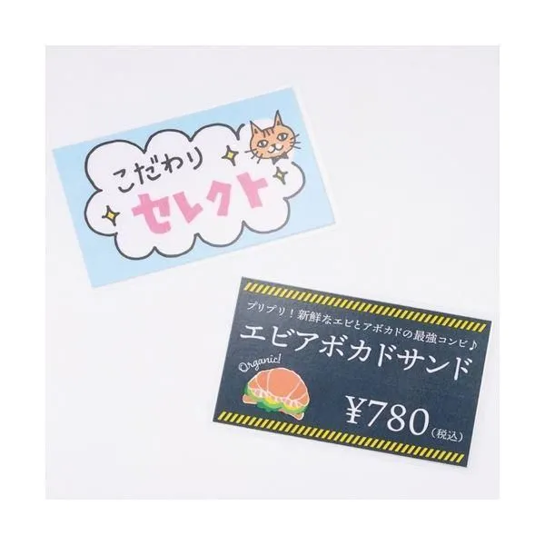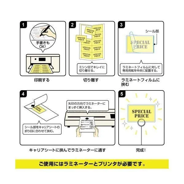 ●専用の厚口用紙に印刷して、フィルムに挟んでラミネートするだけでオリジナルの名刺・カード型POPが簡単に作成できます。