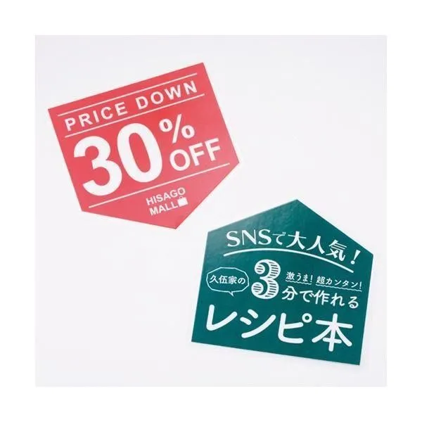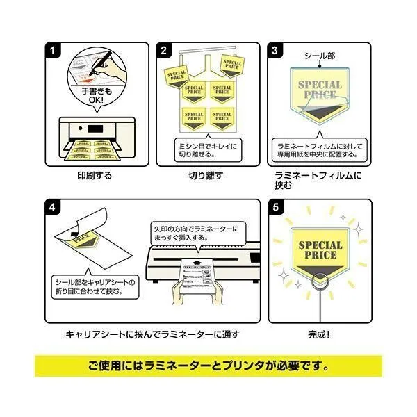●専用の厚口用紙に印刷して、フィルムに挟んでラミネートするだけでオリジナルのホームベース型POPが簡単に作成できます。