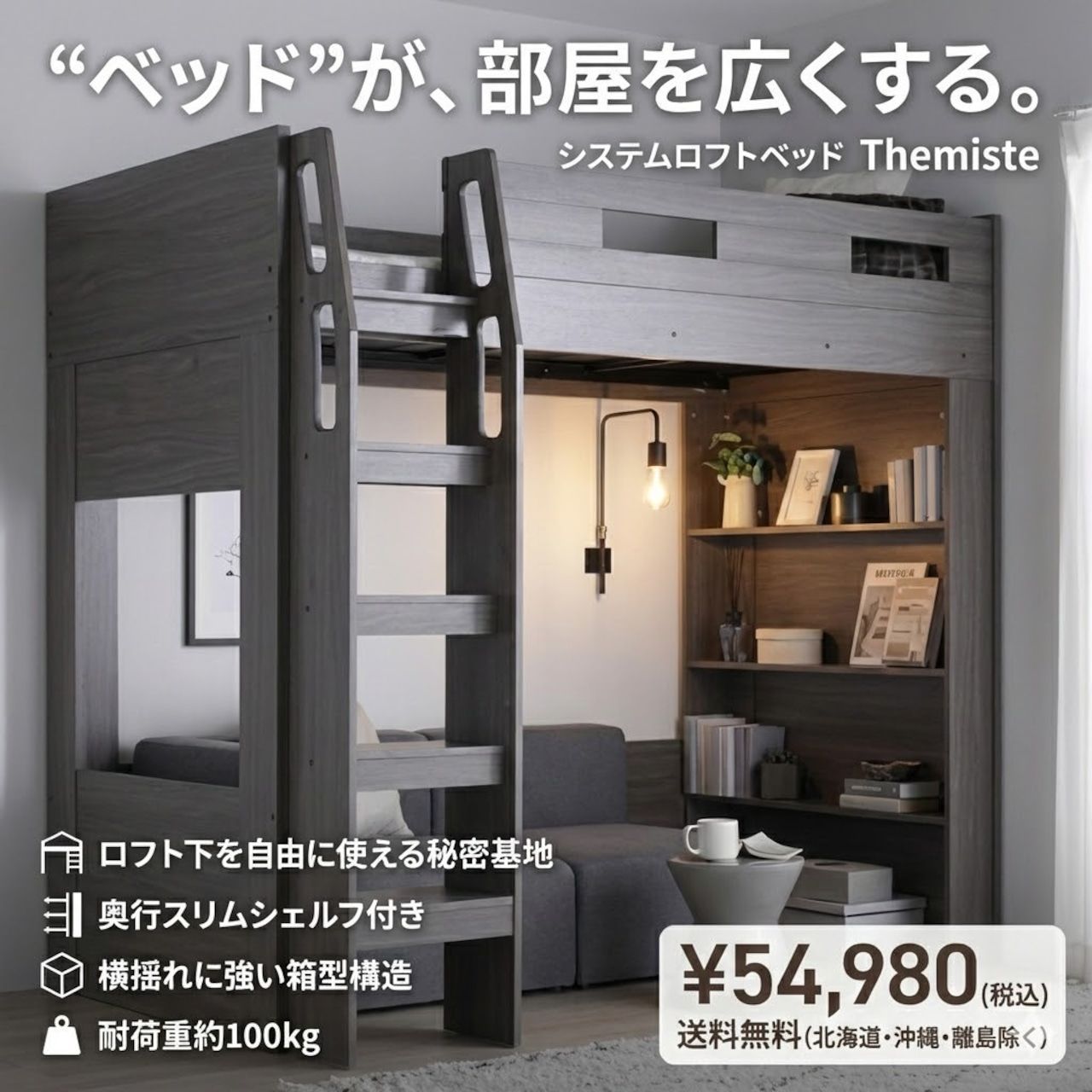 ロフト下を“自由に使える空間”へ変える システムロフトベッド Themiste なら、
