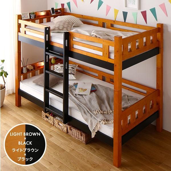 商品名:2段ベッド ベッドフレームのみ ライトブラウン×ブラック 分割可 宮付き 棚付き コンセント付き 照明付き 木製 マットレス別売