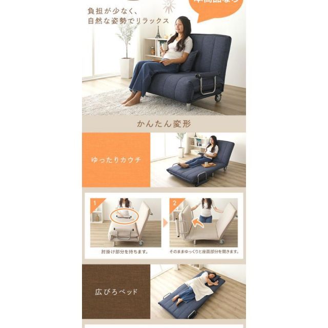 商品名:ソファーベッド 約幅101cm ネイビー 折りたたみ式 リクライニング キャスター 肘付き 3way カウチソファー リビング
