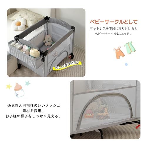 【ベビーサークルとして使用でき】マットレスを下段に取り付けるとベビーサークルになります。通気性と可視性の良いメッシュ素材を採用して、お子様の様子をしかり見えます