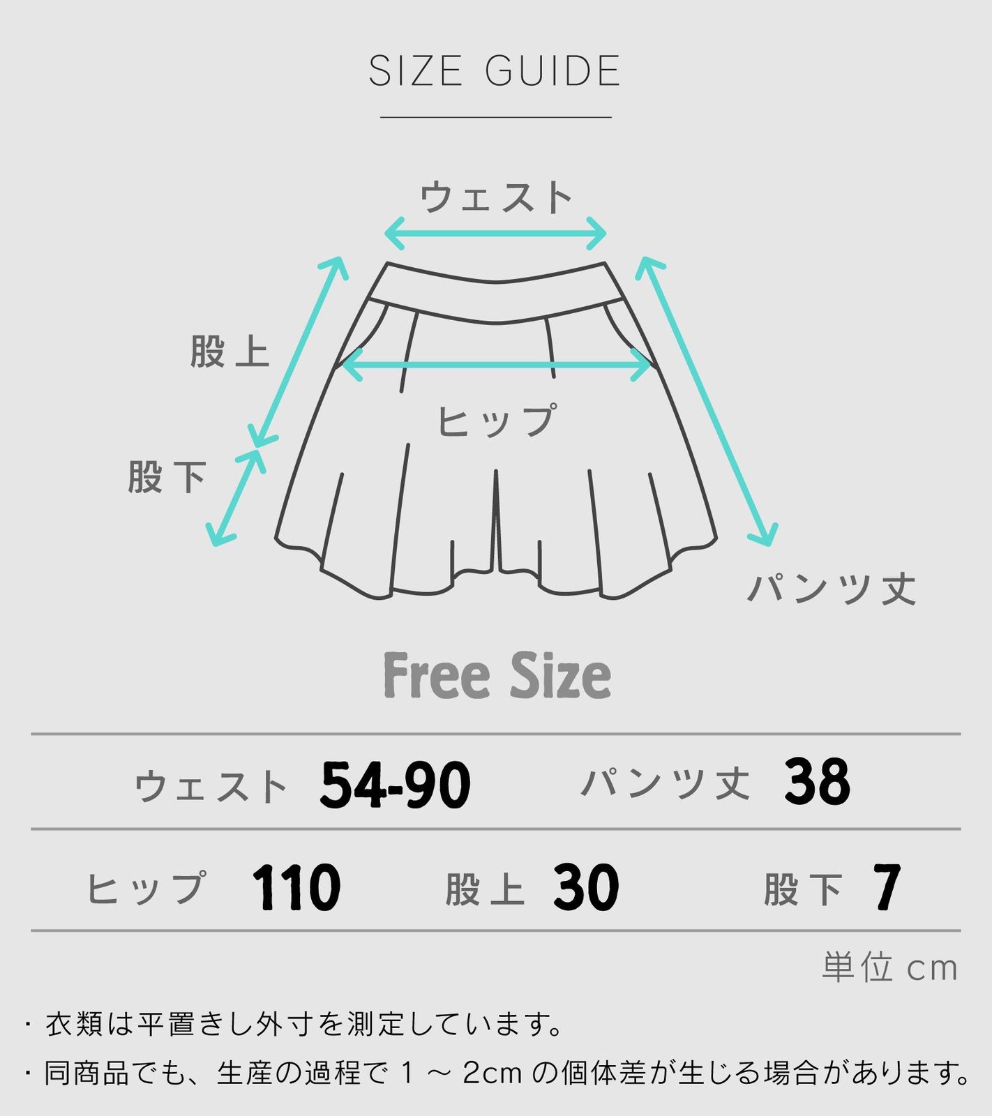 ウェスト:(約)54-90cm パンツ丈:(約)38cm ヒップ (約)110cm 股上 (約)30cm 股下(約)7cm