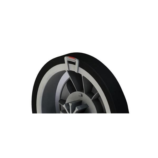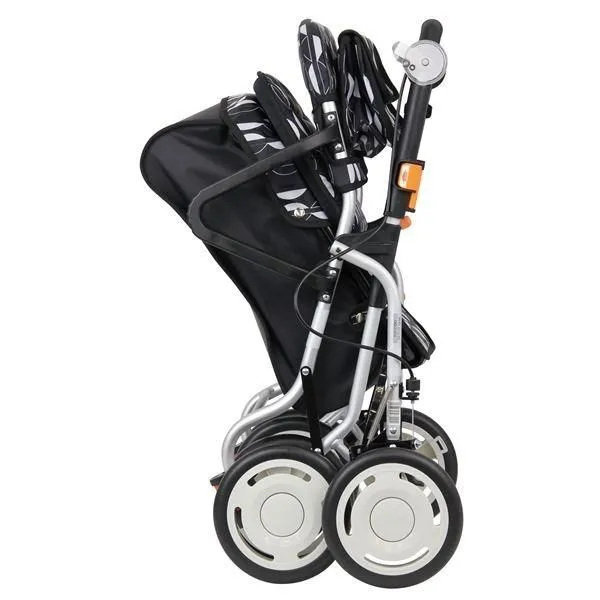 【レコルティ】は北欧テイストのカラーデザインを採用したシルバーカー、エレガントなオレンジとシックなブラックの幾何学模様が印象的。直径19cmの大きなタイヤは安定感と走行性に優れています。座面の後ろには取り外し可能なバック付きで、座面の下にはアレコレつめる大容量のスペースを備えています。