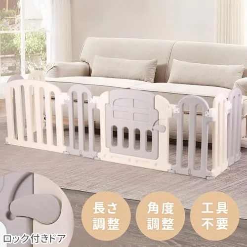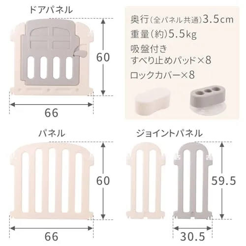 内容:ドアパネル1、パネル1、ジョイントパネル6、吸盤付滑り止めパッド8、ロックカバー8、取扱説明書(英語)、材質:HDPE(高密度ポリエチレン)対象年齢:6か月3歳