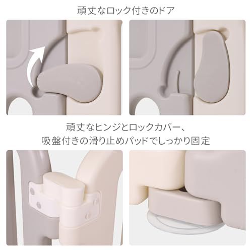 【ドアロック設計】ドアにはロック機能が付いています。ロックは赤ちゃんが容易に解除できないよう硬めに取り付けられています。赤ちゃんの反対側にロックが付いたドアを設置すれば、危険な場所に侵入したりサークルからの飛び出し防止に役立ちます。
