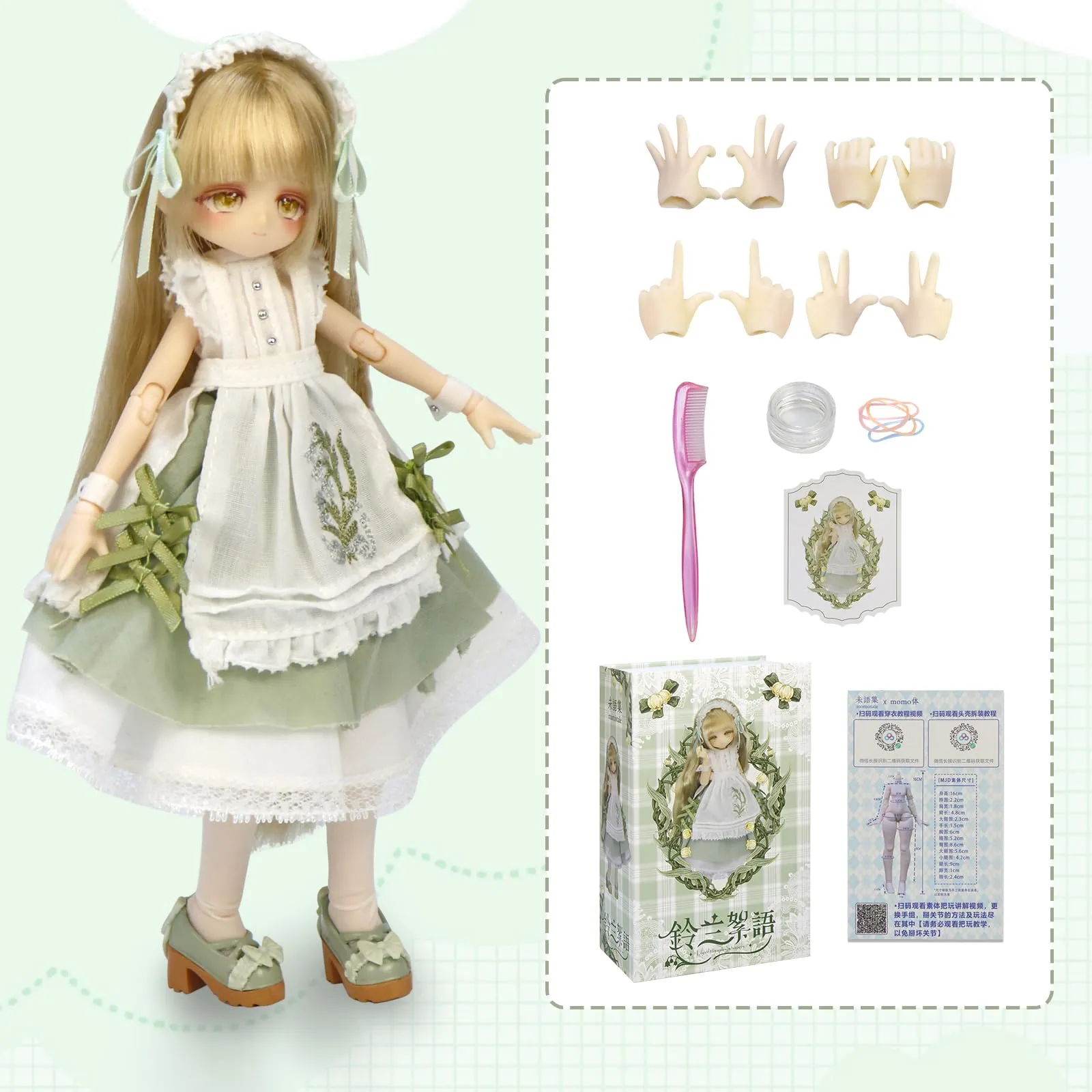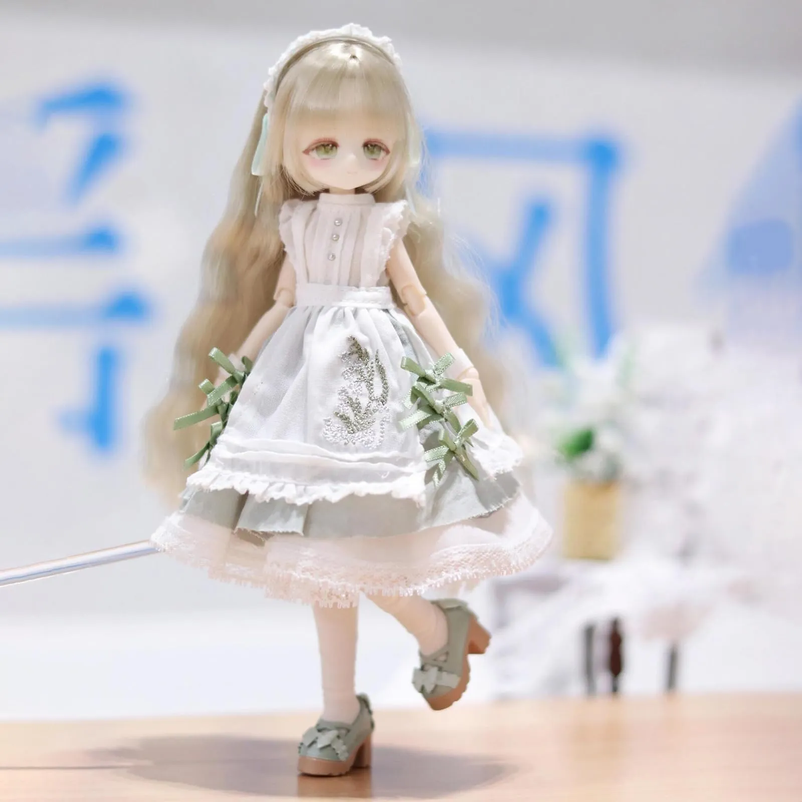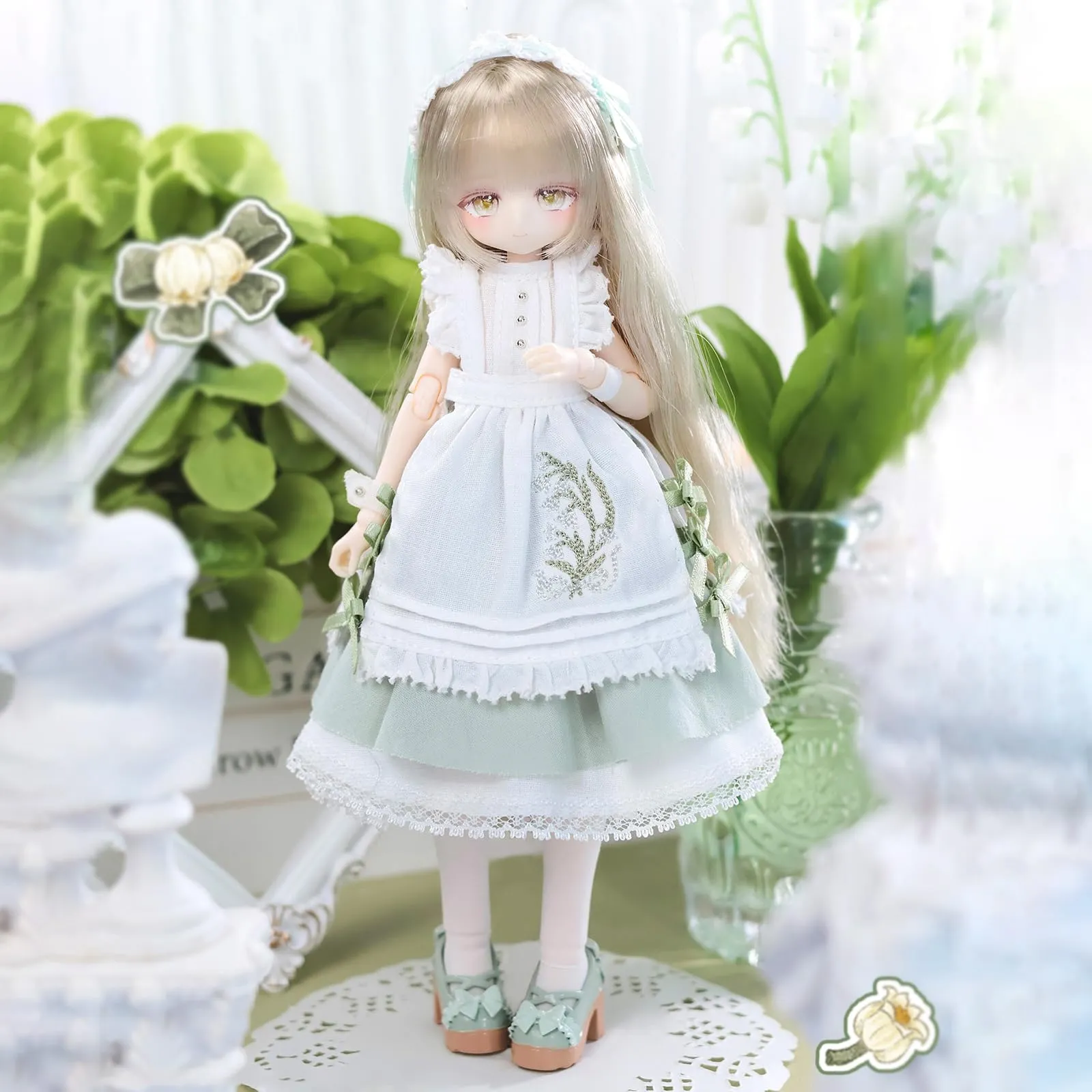 【田園テイスト全開のコーディネート】抹茶色のドレスと鈴蘭のエプロンが特徴的な約20cmの植毛可動ドール。交換用服装セットでさらにバリエーションが広がります。