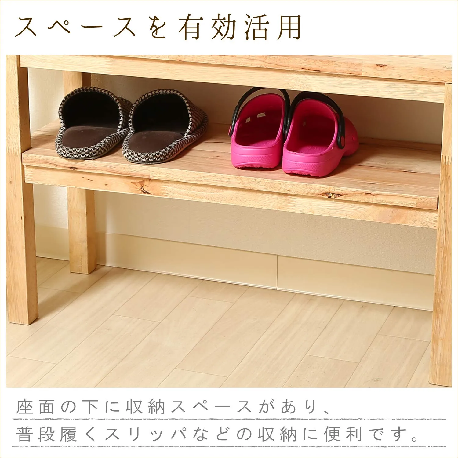 座面の下の棚は普段履くスリッパの収納などに便利です。