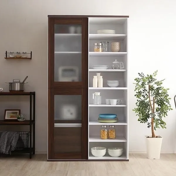 収納スペースを左右に分け、左側に家電収納棚やフルオープンの引出し・右側に計8段の食器収納棚を設けガラスのスライドドアで楽に開閉・切替が可能です。
