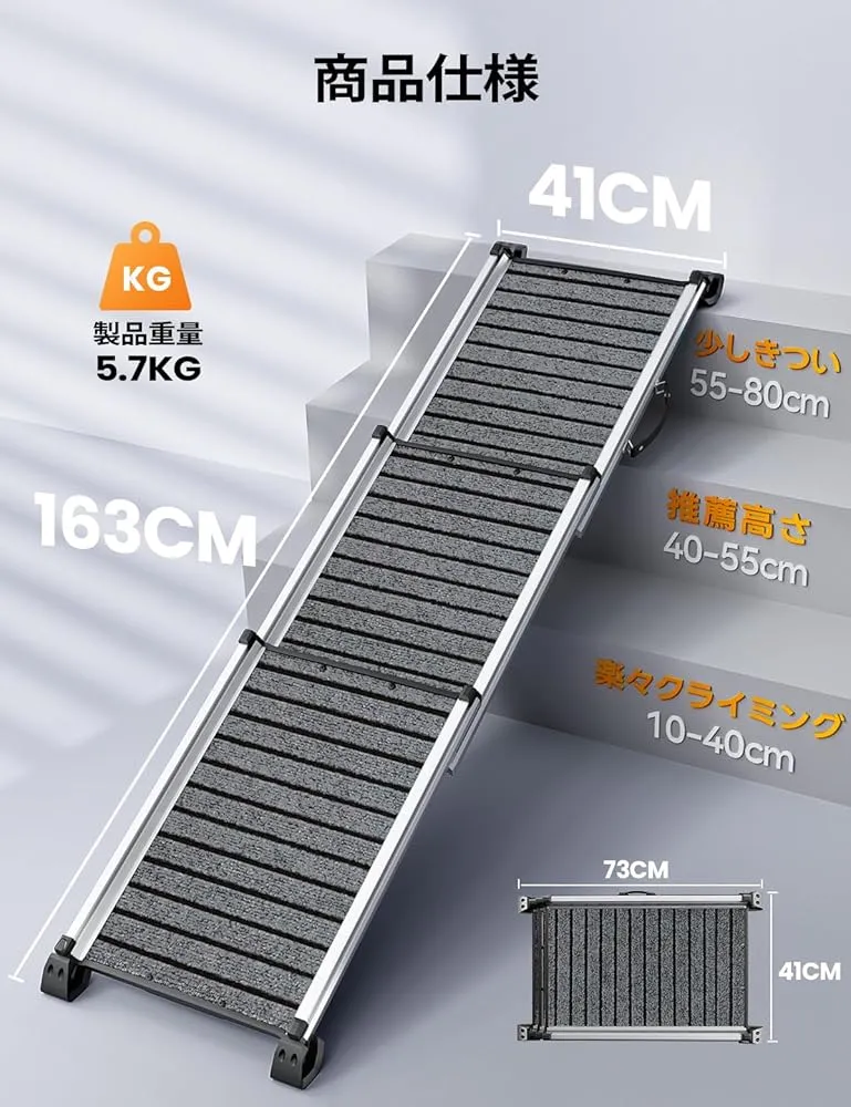高品質アルミ製で200kgまで耐荷重:市販の木製やプラスチック製のペットランプと比べて、当社のアルミ製製品はより頑丈で耐久性に優れています。最大200kgまで対応可能なので、大型犬でも安心です。