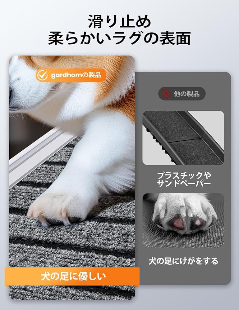 やさしい素材で犬の足を保護:表面はカーペット素材を使用しており、柔らかくて愛犬の足に優しい設計です。滑りにくいので、ペットが安心して歩行でき、爪を傷つける心配もありません。