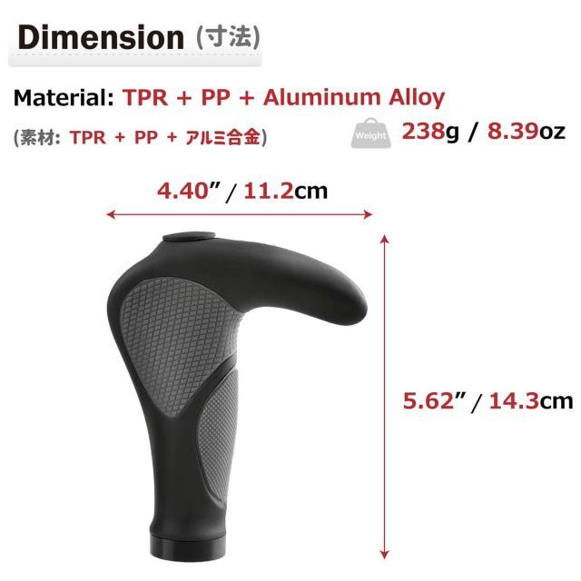 【滑り止め】バーエンドハンドルに膨らみがあり、滑りにくくて地面からの衝撃を吸収できます。手の平が接する面積が広く、グリップに手を乗せてリラックスして走れます