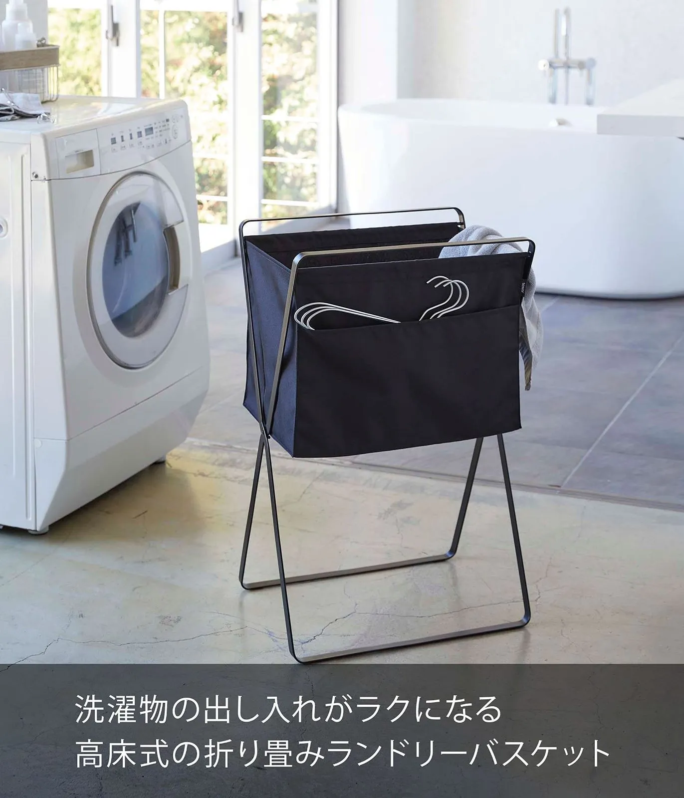 バスケットに高さがあるから、洗濯物の出し入れの際に腰への負担が軽減される、高床式の折り畳みランドリーバスケット。