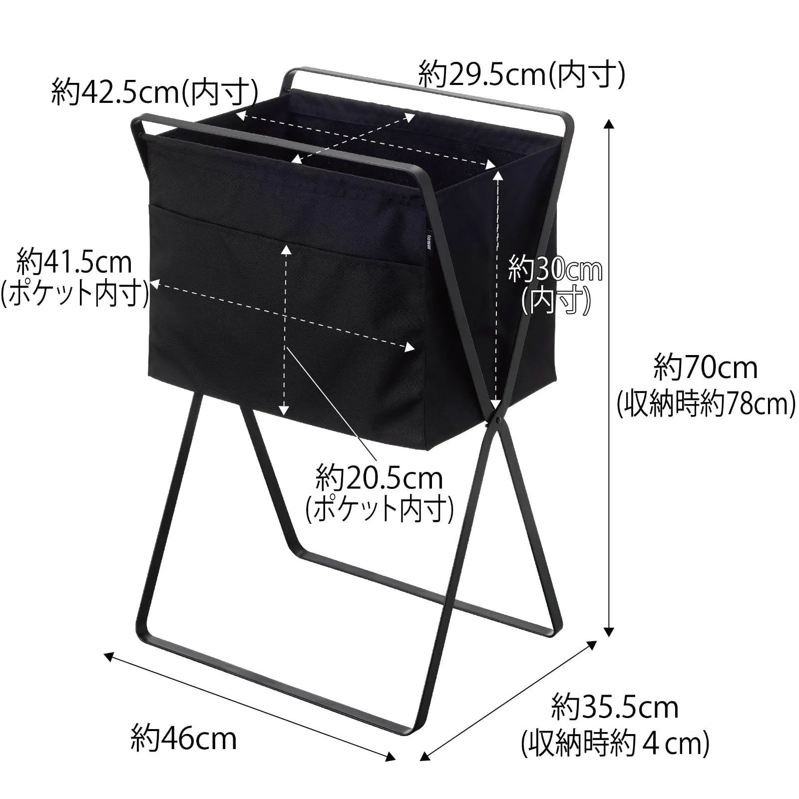 内寸:バスケット:約W42.5×D29.5×H30cm、ポケット:約W41.5×H20.5cm、床からバスケットまでの高さ:約H36.5cm