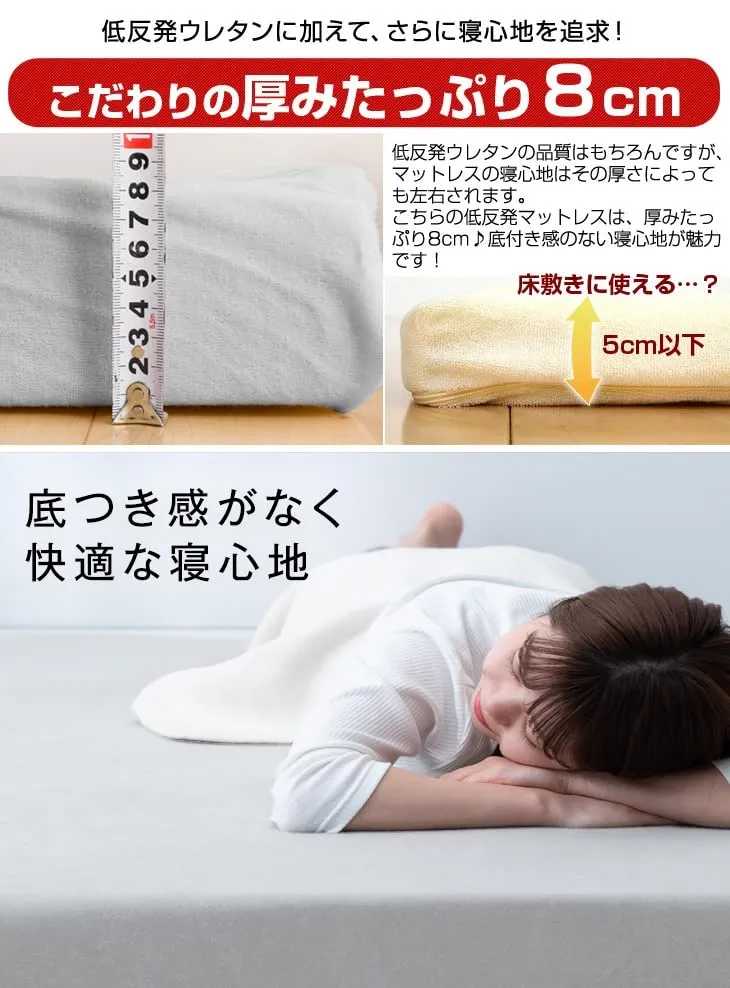 外寸:幅97x長さ195x厚み8cm(シングルサイズ) / 重量:約5kg(中芯重量:約4.2kg)