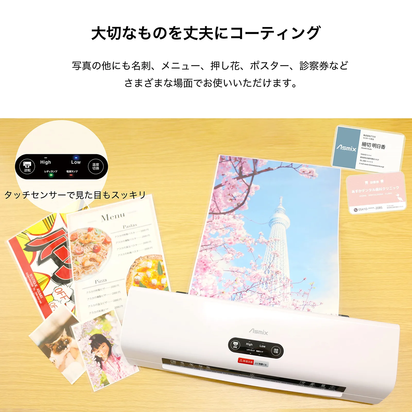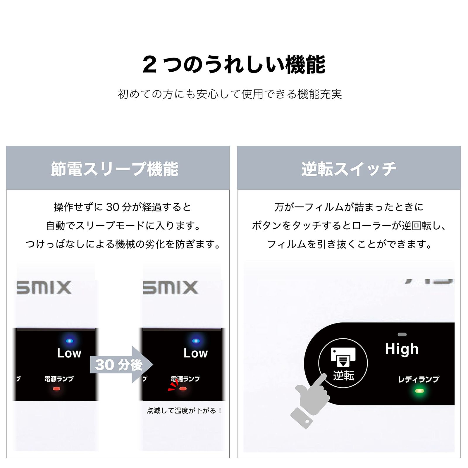 ウォームアップ完了まで用紙が入っていかないフィルム挿入防止機能を搭載。ウォームアップ中の誤挿入によるラミネートミスを防止し無駄を防ぎます。