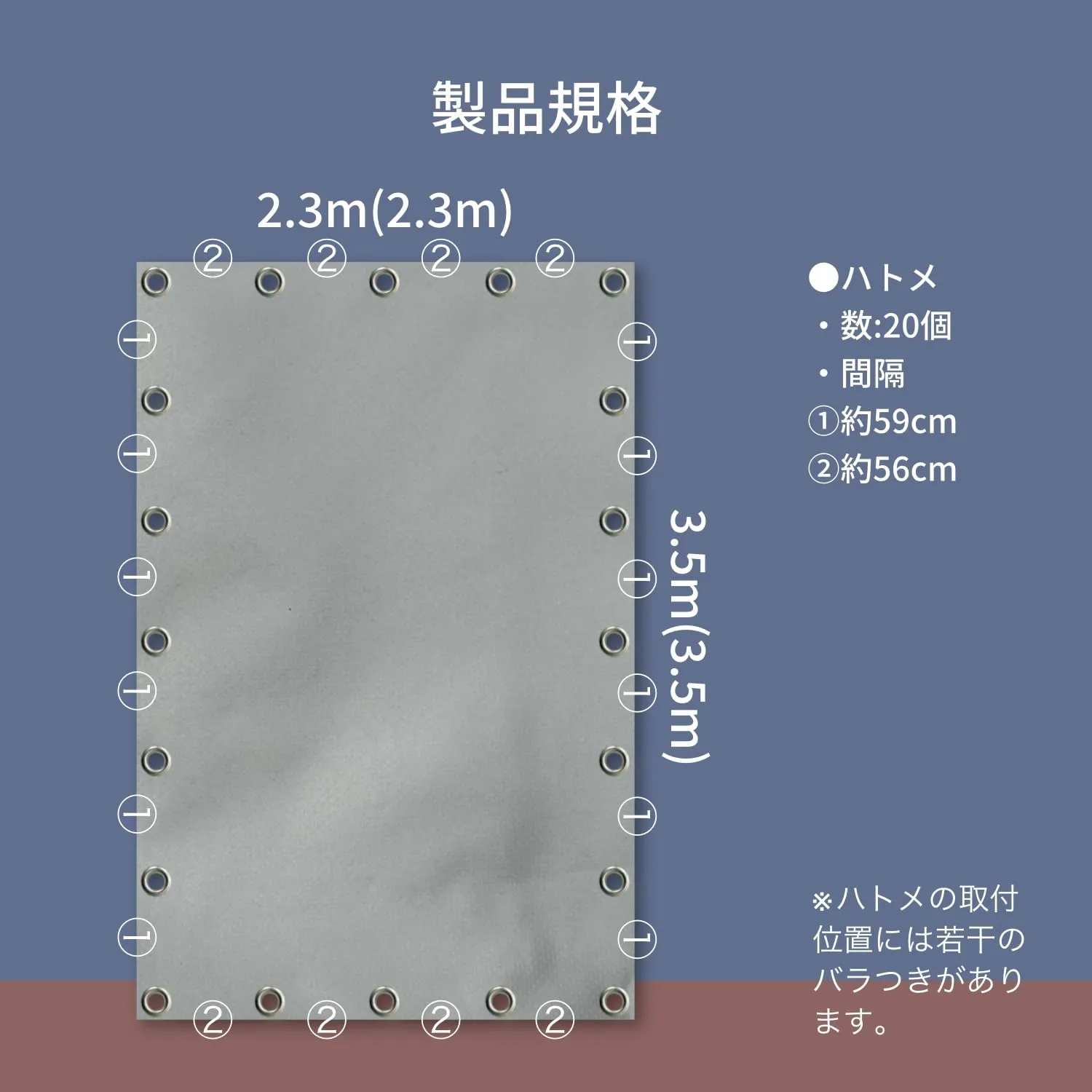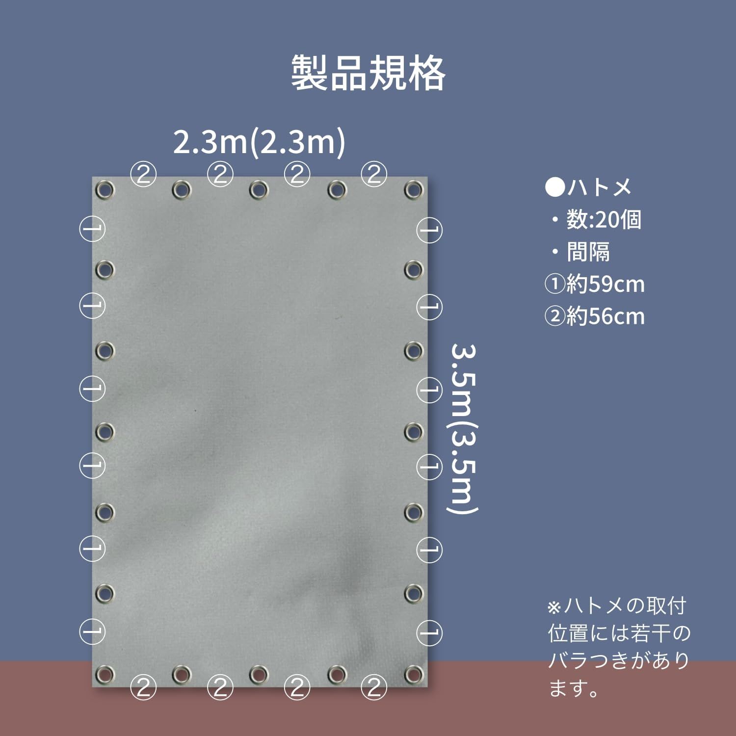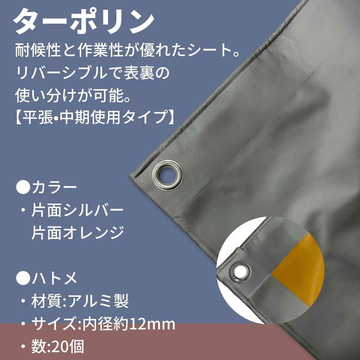 材質 シート:ポリエステル(PVCコーティング)/ハトメ:アルミ(内径:12㎜)の使い分けが可能。