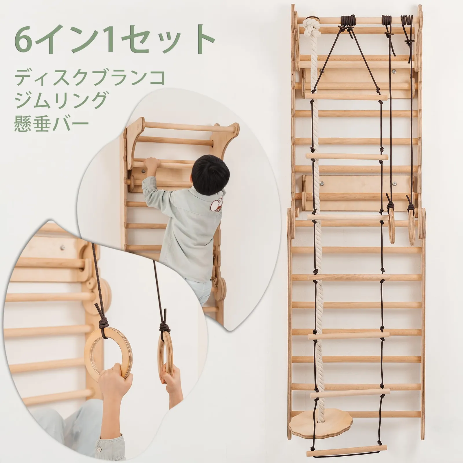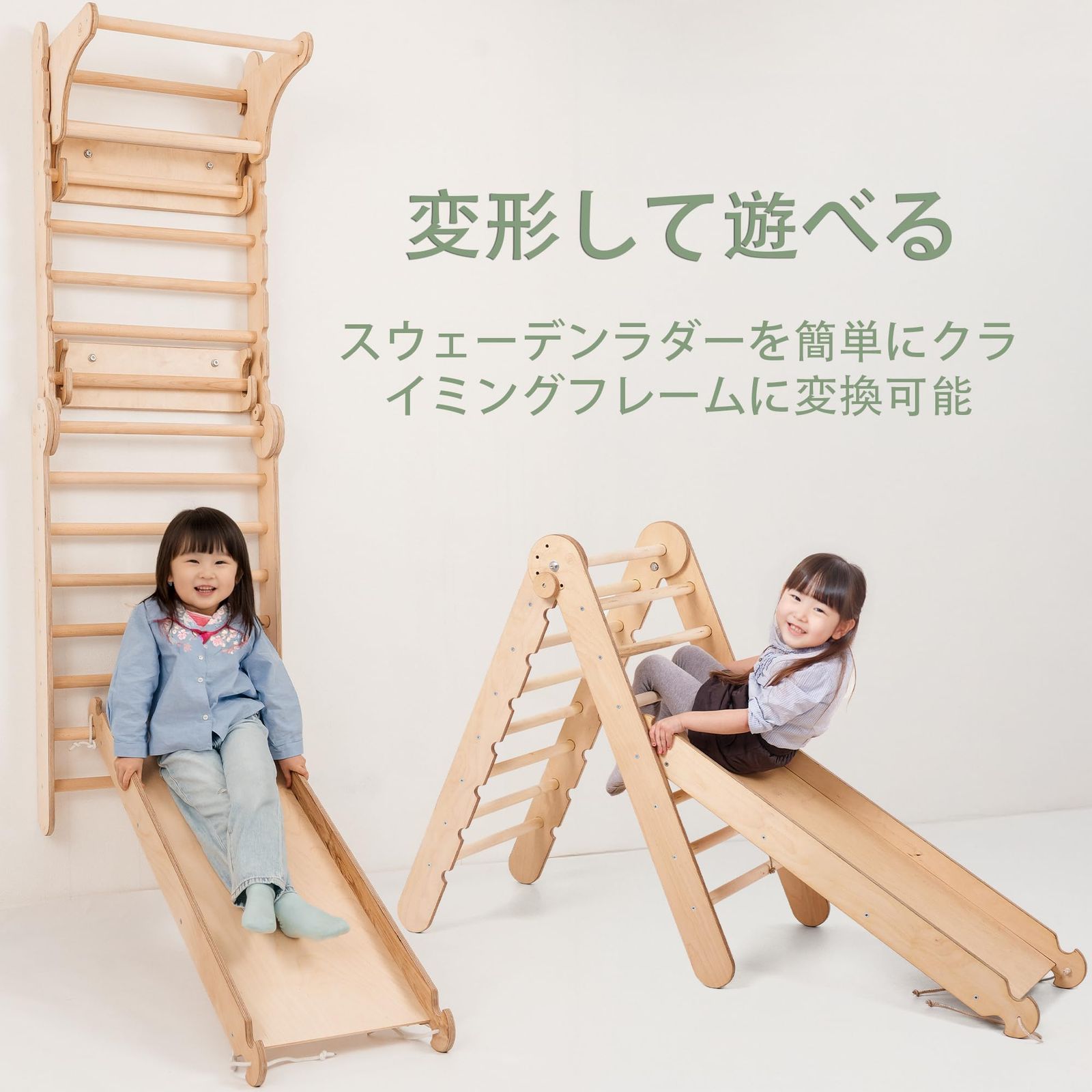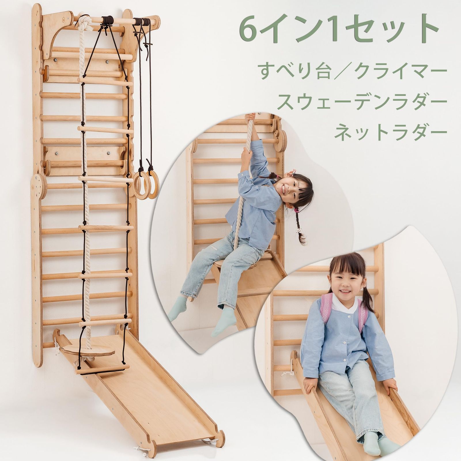【多機能6-in-1プレイセット】 クライミングラダー・すべり台・ブランコ・体操用リングへ変形可能。室内で楽しく体を動かしながら、バランス感覚・協調性・運動能力の発達を促します。