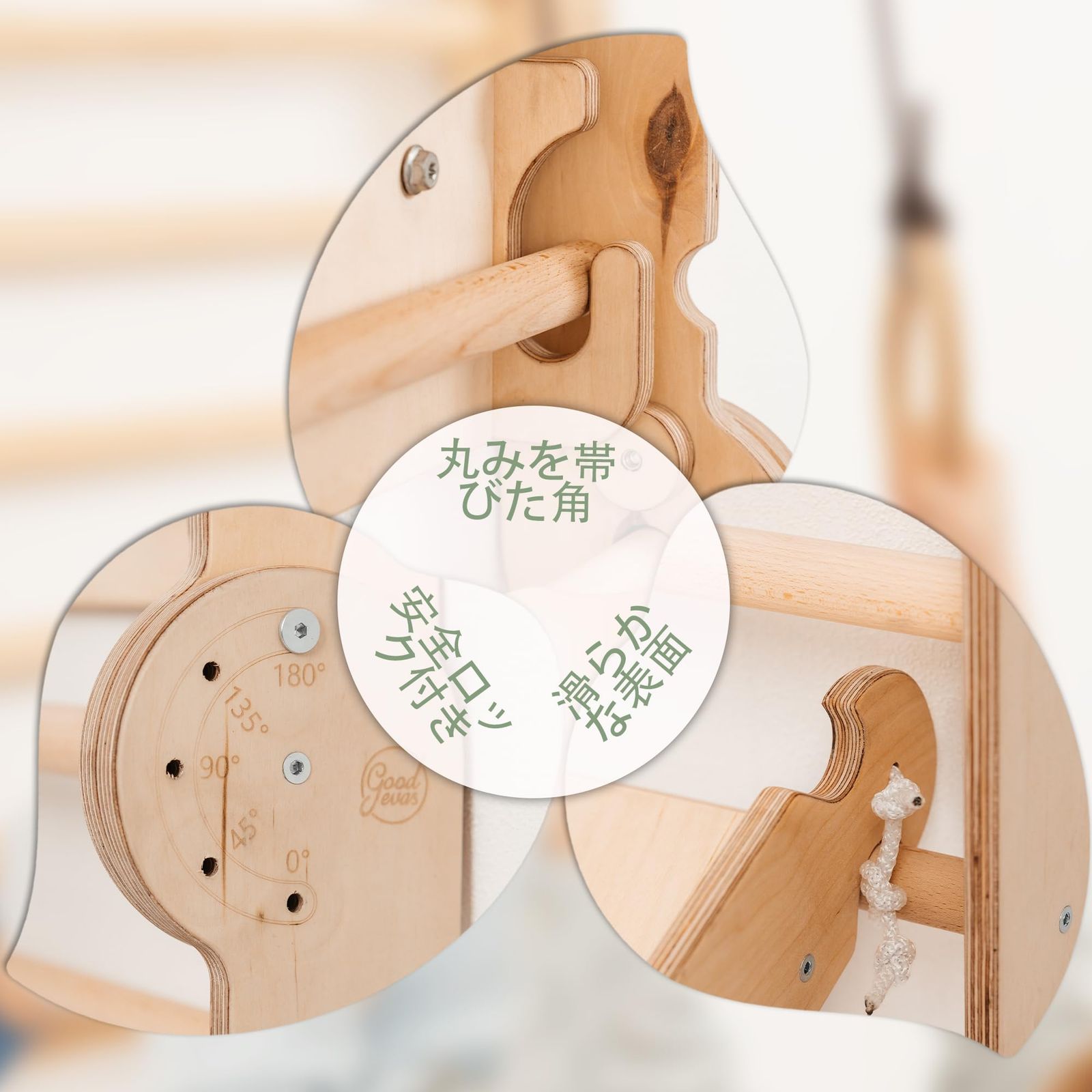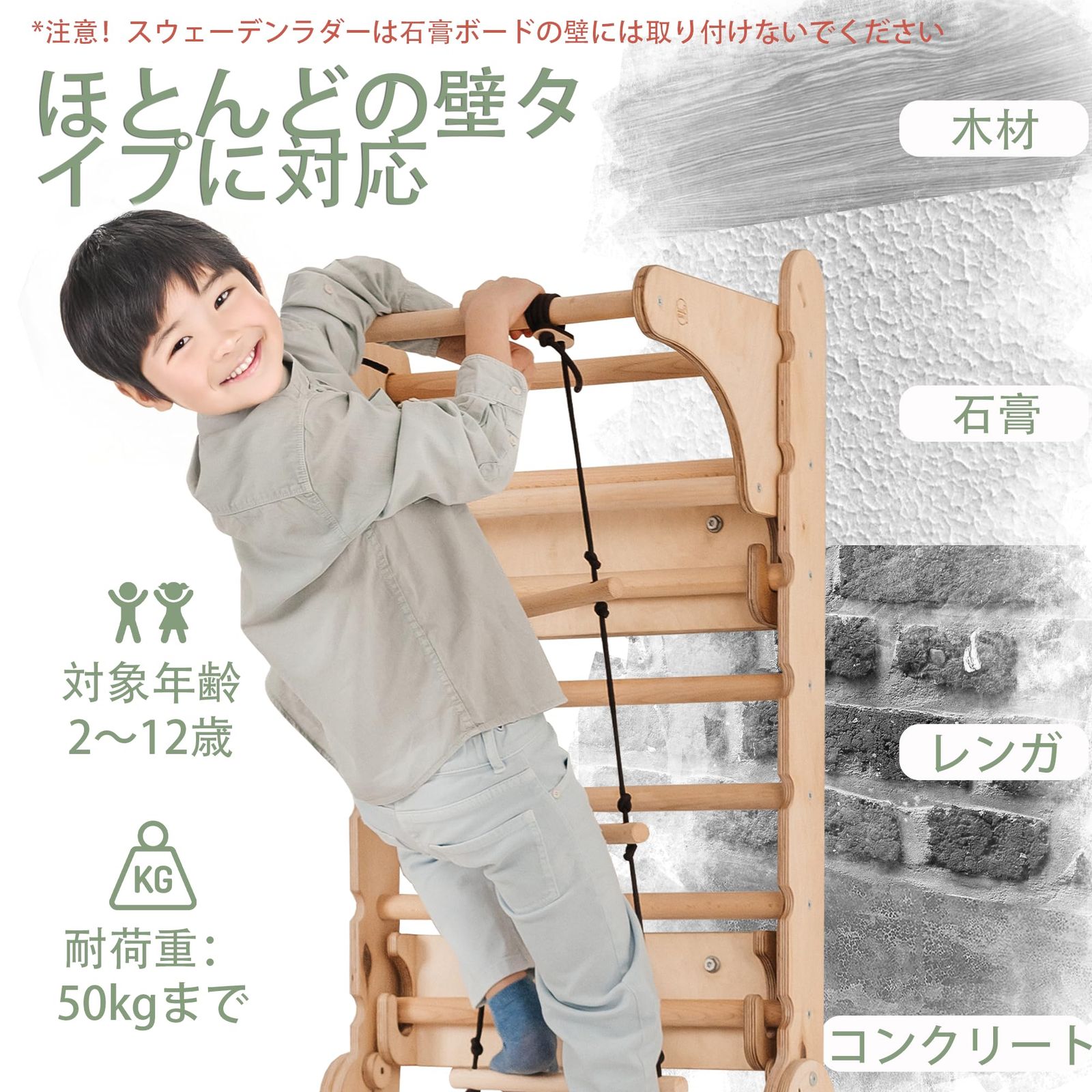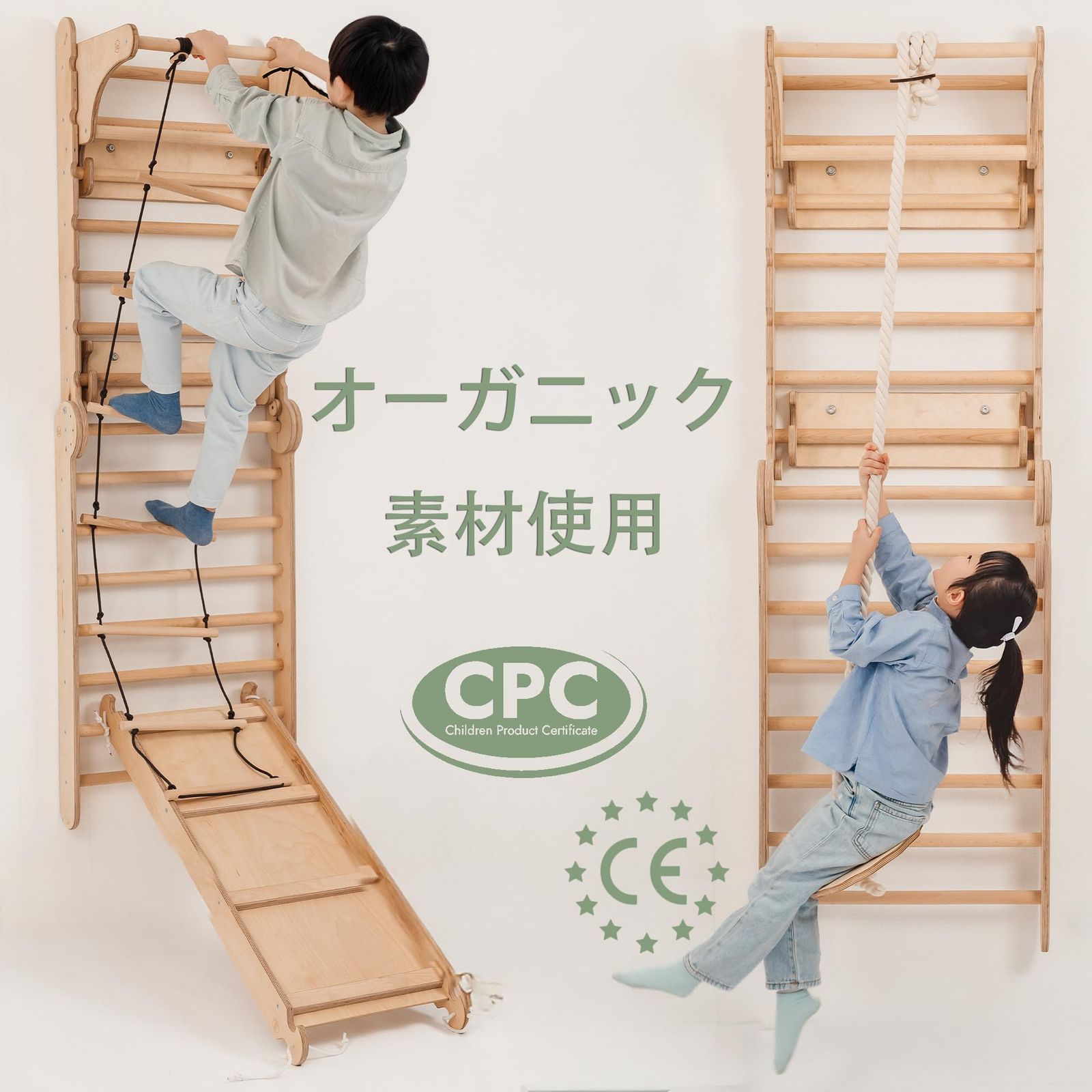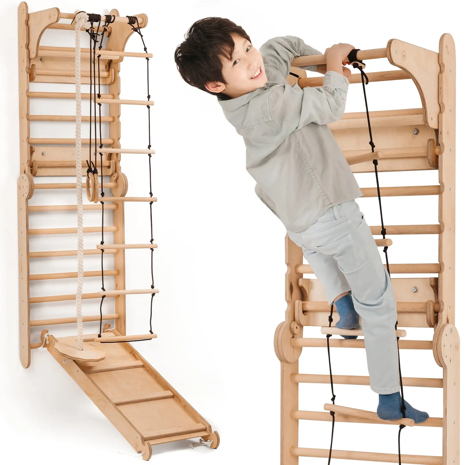 【多機能6-in-1プレイセット】 クライミングラダー・すべり台・ブランコ・体操用リングへ変形可能。室内で楽しく体を動かしながら、バランス感覚・協調性・運動能力の発達を促します。