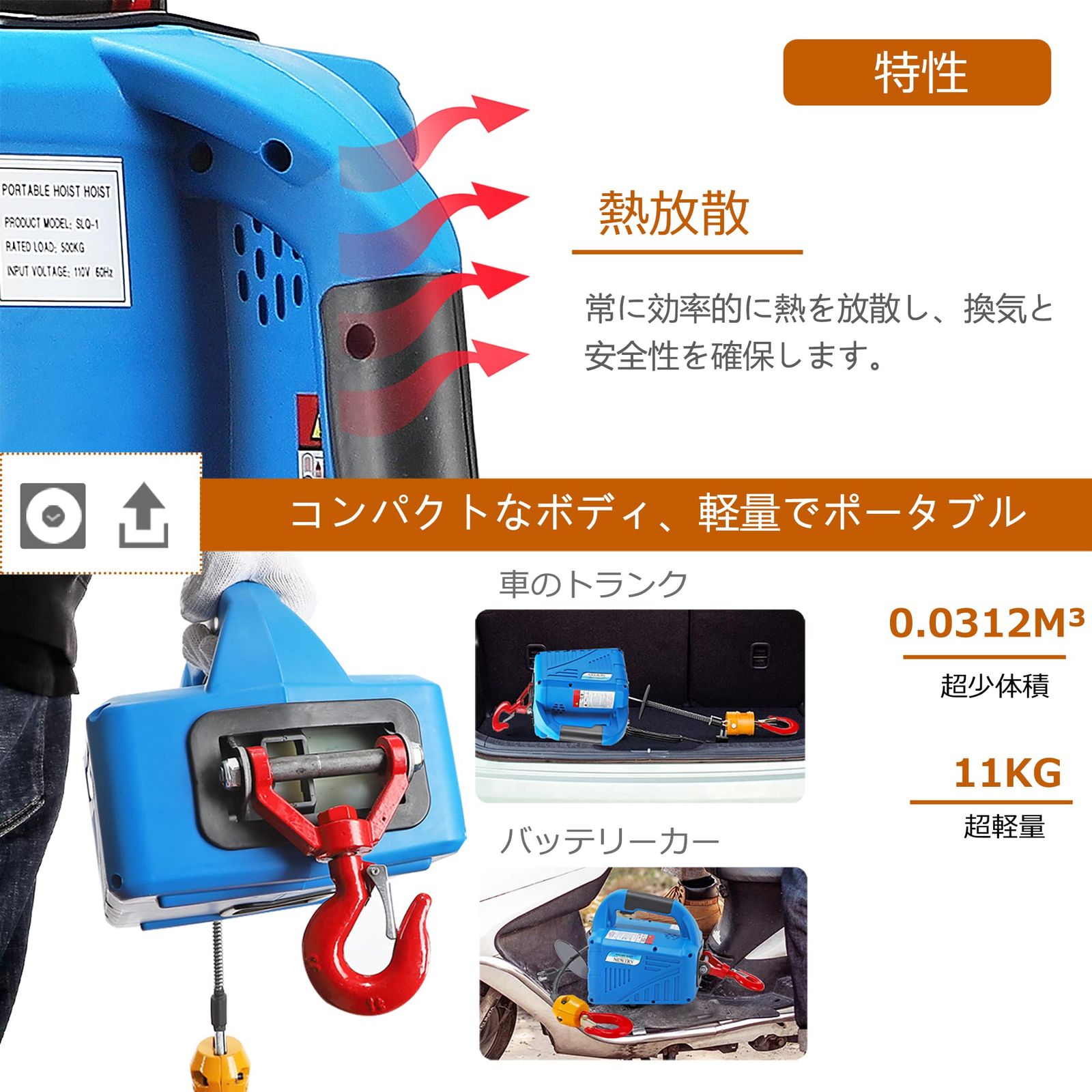 【デザイン】:放熱率よいアルミ製ギア箱;巻き込み防止機能;強動力全銅モーター;360°回転できる脱落防止フック。
