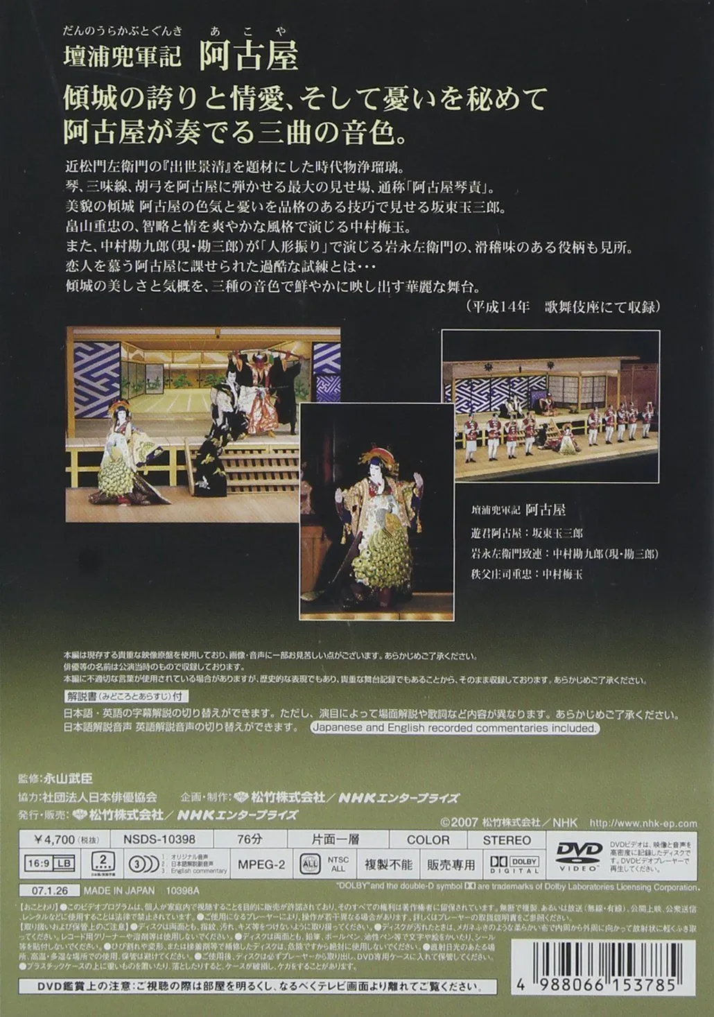 ご覧いただきありがとうございます。 歌舞伎名作撰 壇浦兜軍記 阿古屋 壇ノ浦兜軍記-阿古屋の琴責-(だんのうらかぶとぐんき―あこや―) 出演:坂東玉三郎 中村勘九郎(現・勘三郎)ほか(収録:平成14年 歌舞伎座) 他のショップでも販売しておりますので、 お早目の購入をおススメします。 どうぞよろしくお願いいたします。