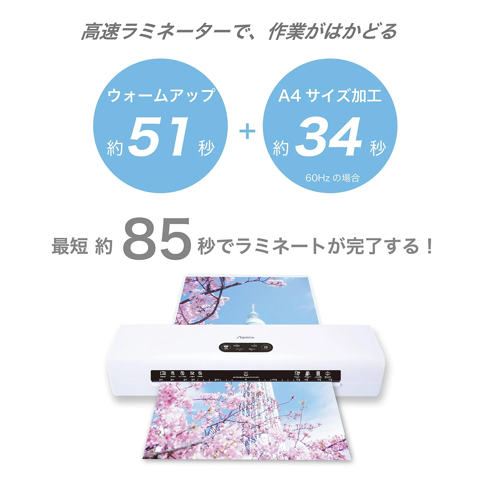 ウォームアップは51/57秒(50/60Hz)で加工速度は42秒/34秒(50/60Hz)とスピーディにラミネートできます。