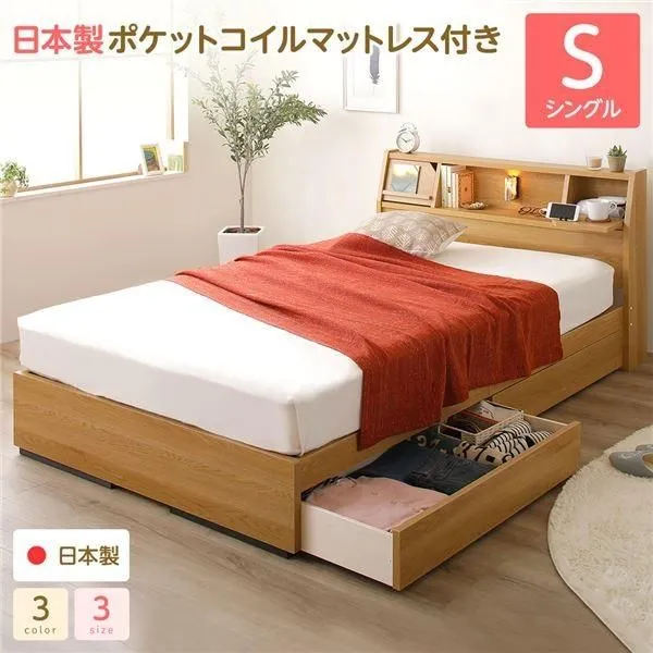 商品名:ベッド 日本製 収納付き 引き出し付き 木製 照明付き 棚付き 宮付き 『Lafran』 ラフラン シングル 日本製ポケットコイルマットレス付き ナチュラル