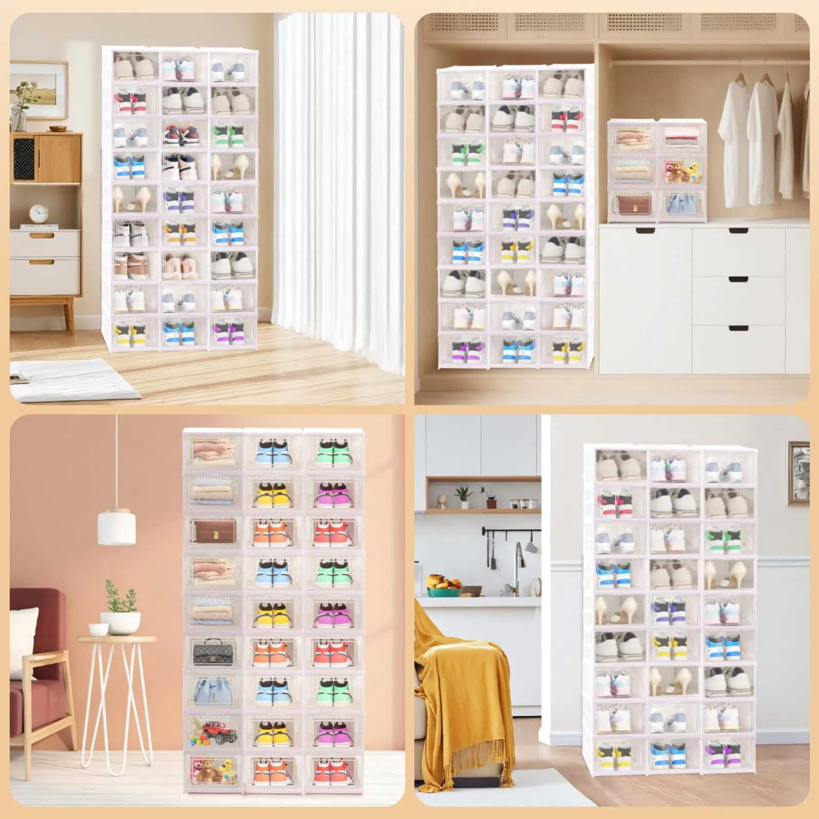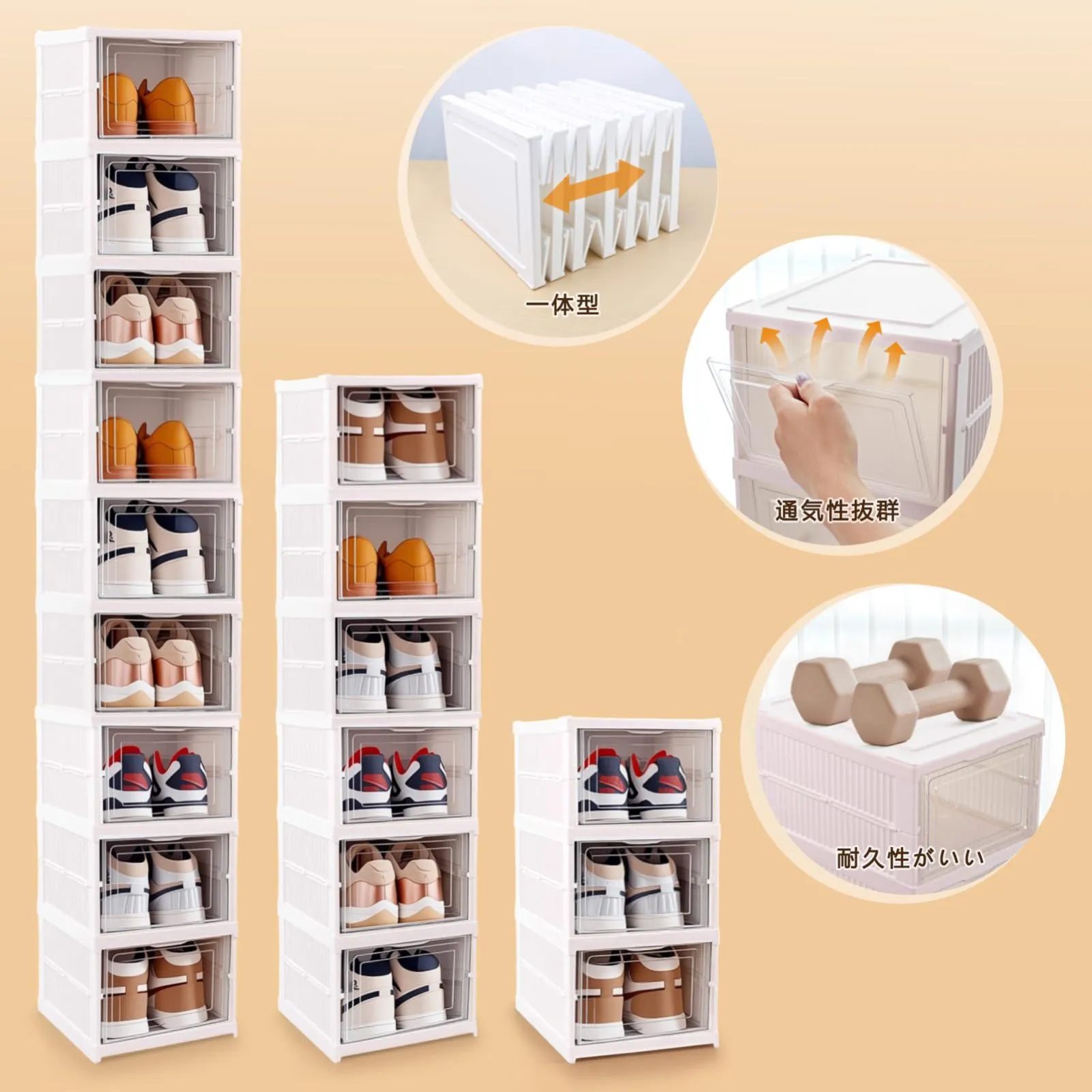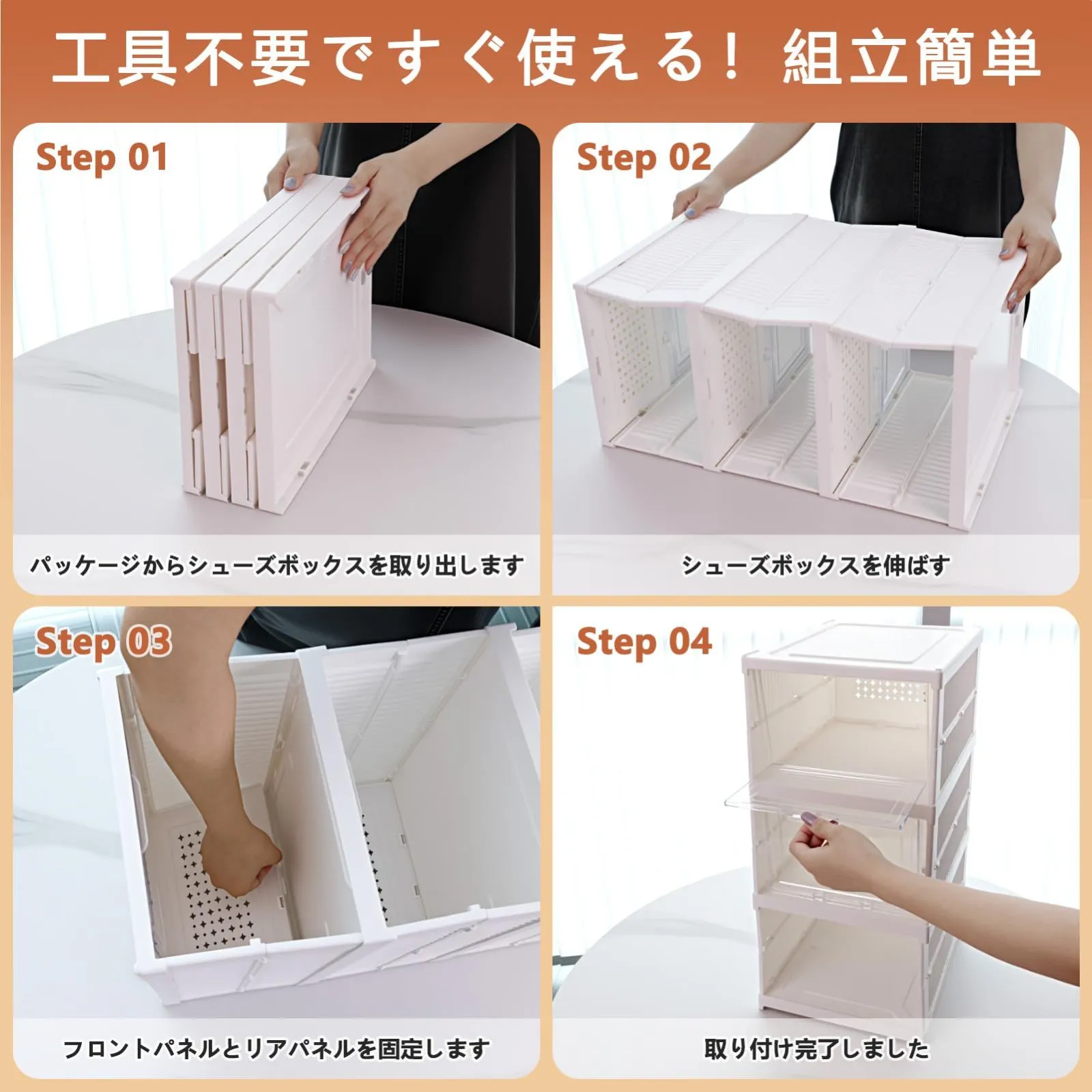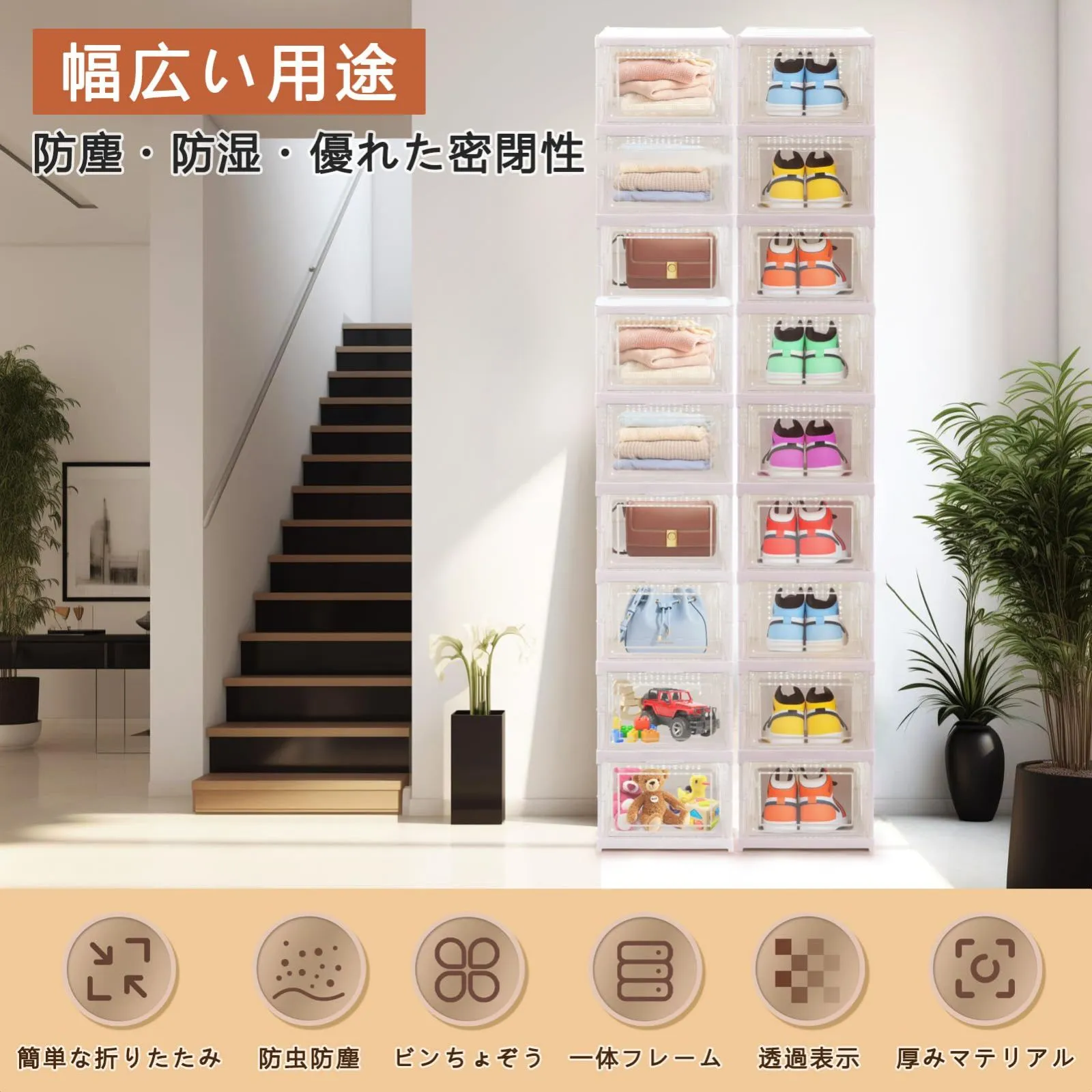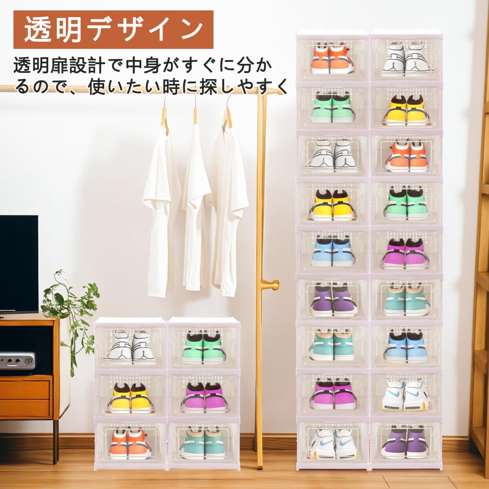 【頑丈で積み重ね可能】この折りたたみ式シューズボックスは丈夫なPP+PE素材で作られています。 厚みのある設計で、信頼性と耐久性をします。 シンプルなインターロック設計により、シューズボックスを重ねてしっかり固定できます。防塵と防水を兼ねます。
