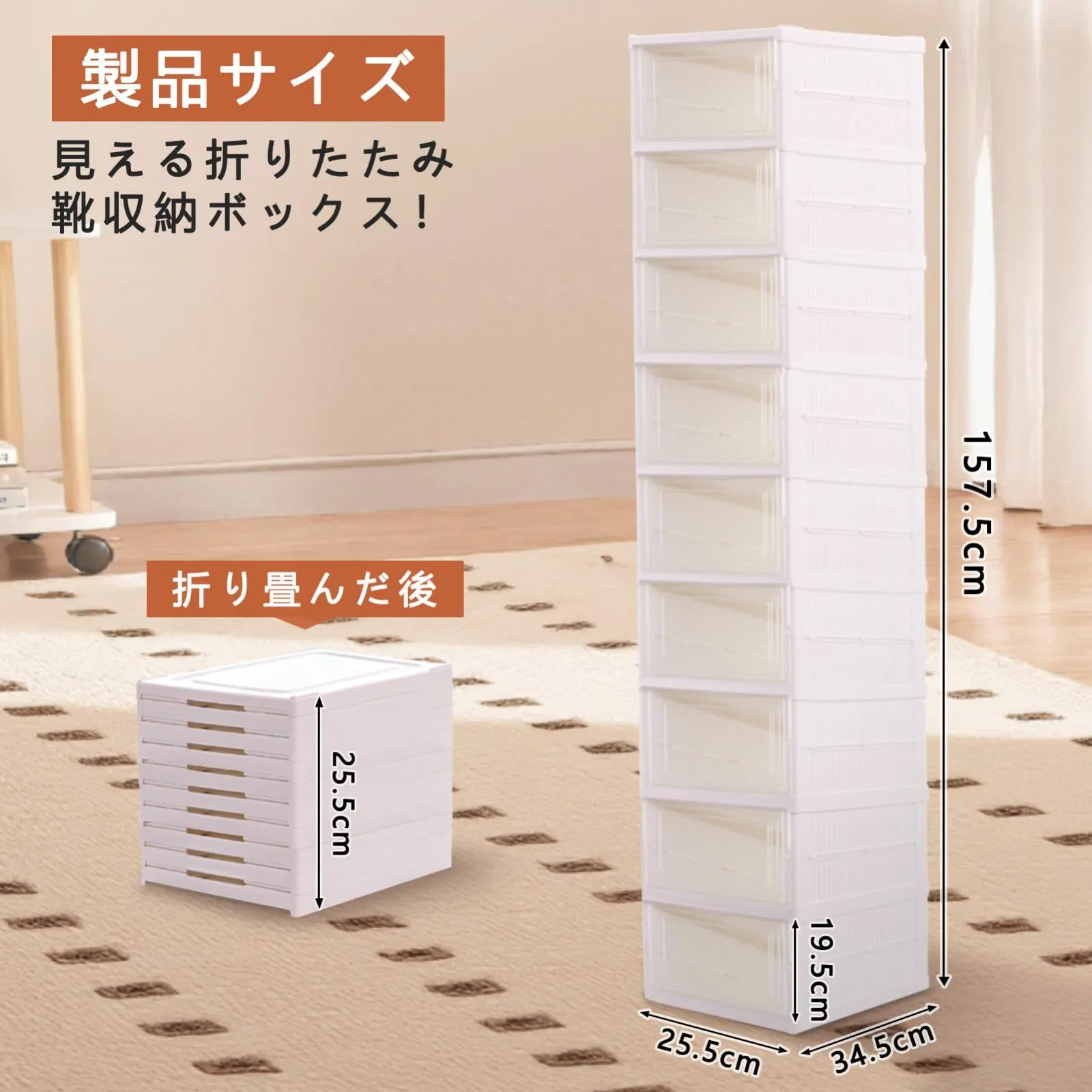 【大容量収納で靴の整理が簡単】9段:長さ25.5cm x 幅34.5cm x 高さ157.5cm;折りたたみ時の高さ:25.5cm。この大容量のシューズボックスは、フラット、スニーカー、フリップフロップ、サンダル、ウェッジ、ランニングシューズなど様々なタイプの靴を整理できます。また、耐荷重設計により、重い靴やブーツも安心して収納可能です。日々の使い勝手が向上し、キッチンや玄関周りが整理整頓されます。