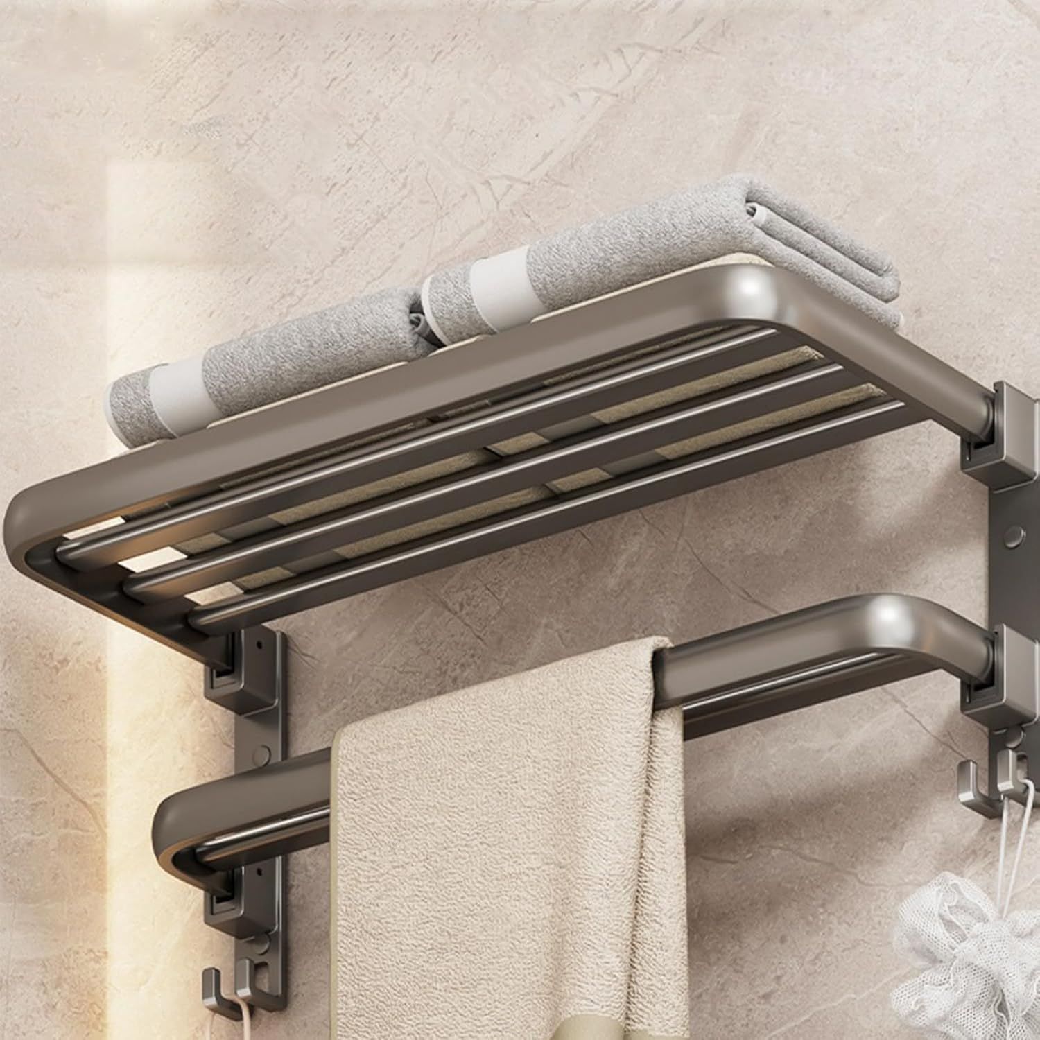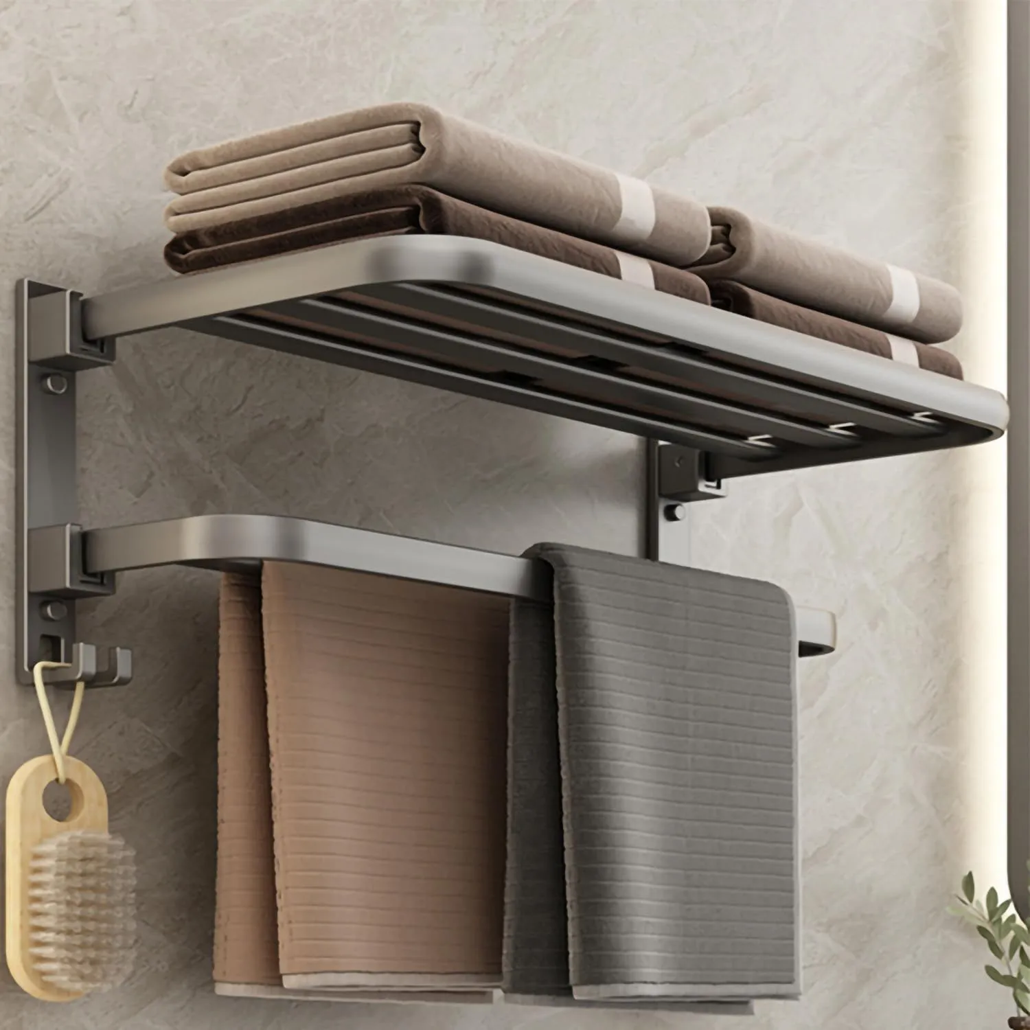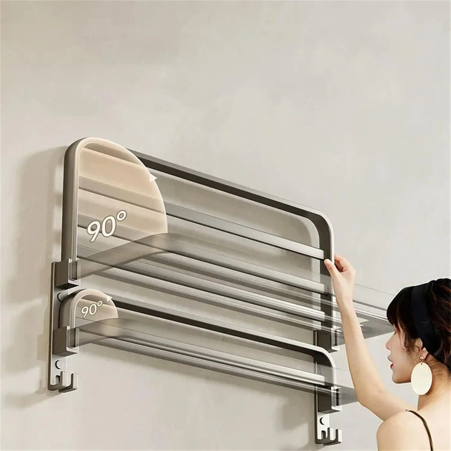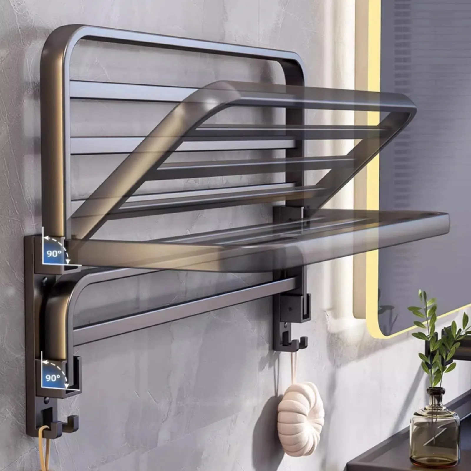 【90°ダブル折りたたみ式で省スペース】使用時は広げてタオルや衣類を収納でき、不要時は90°上向きに折りたたんで壁にぴったり収納。狭いスペースでも邪魔にならず、スッキリとした見た目を保ちます。