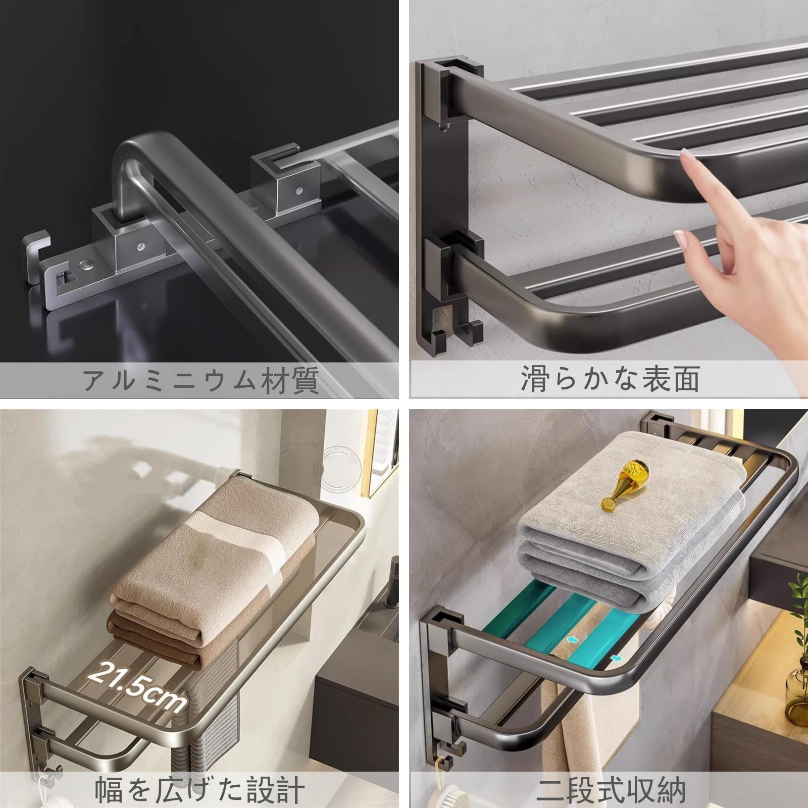 【製品仕様】タオル掛け /タオルハンガー サイズ:長さ50x幅 21.5x 高さ17.5cm 材質:アルミニウム 2段式設計。取付方式:強力粘着シート(平滑タイル対応)+ステンレスネジキット付属 。インストール方法:詳細ページのインストールビデオを参照してください。