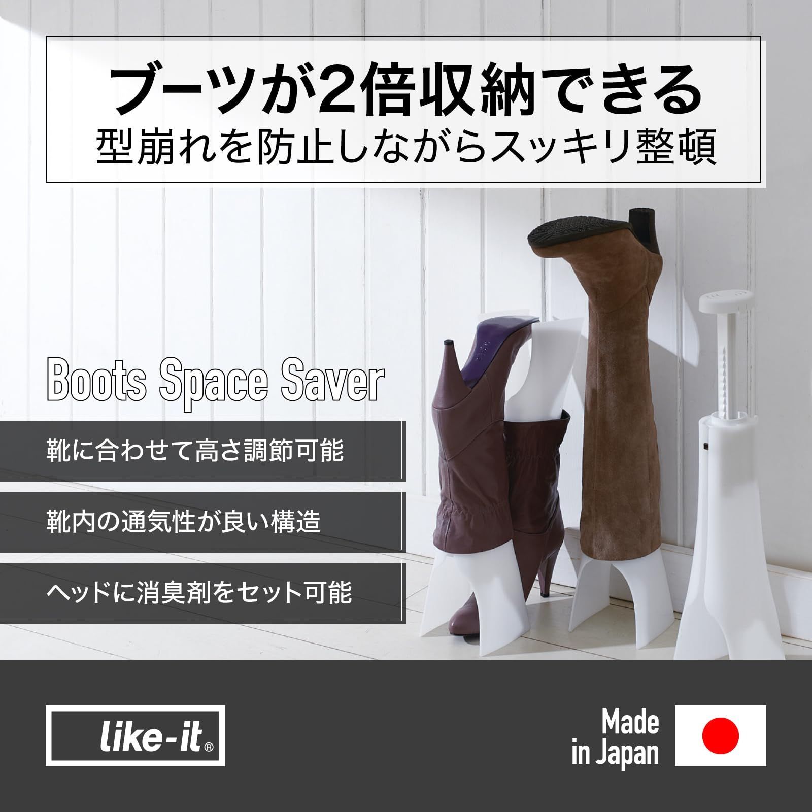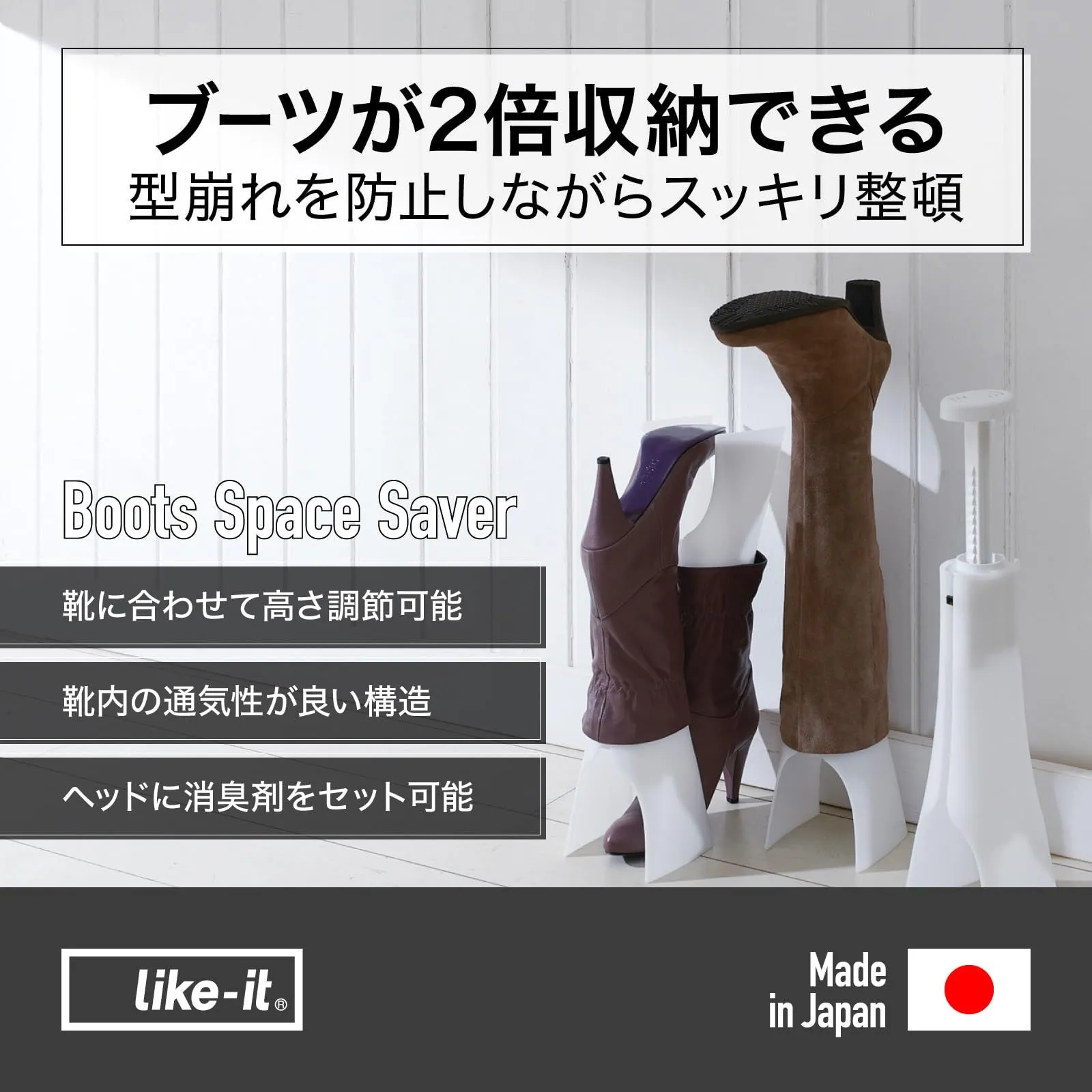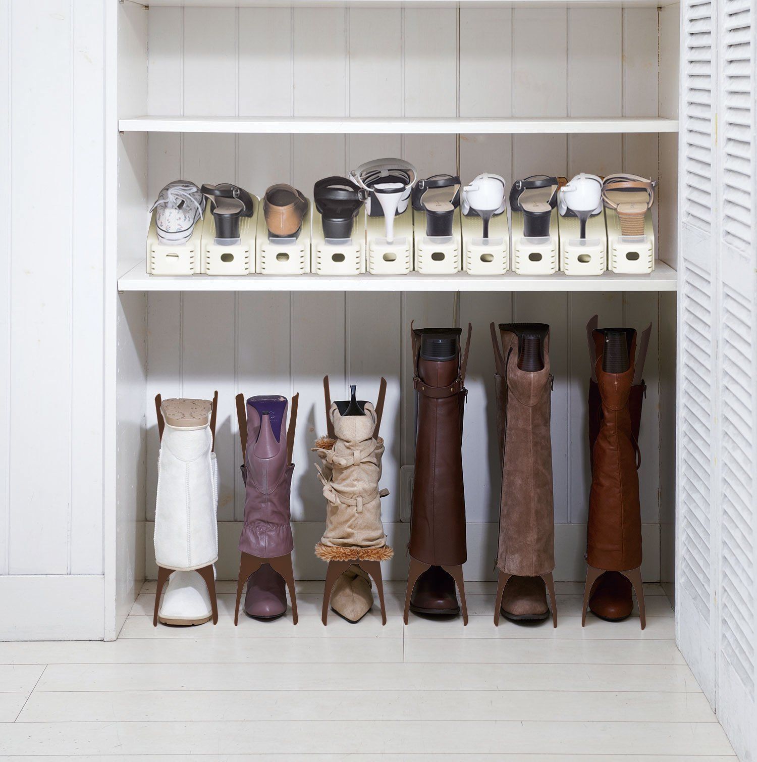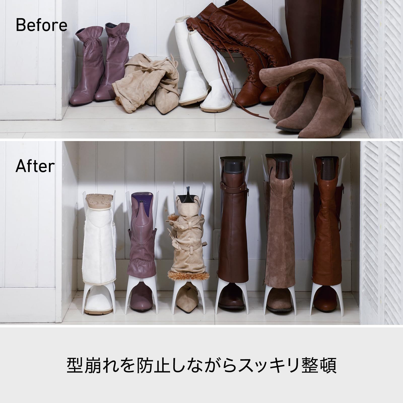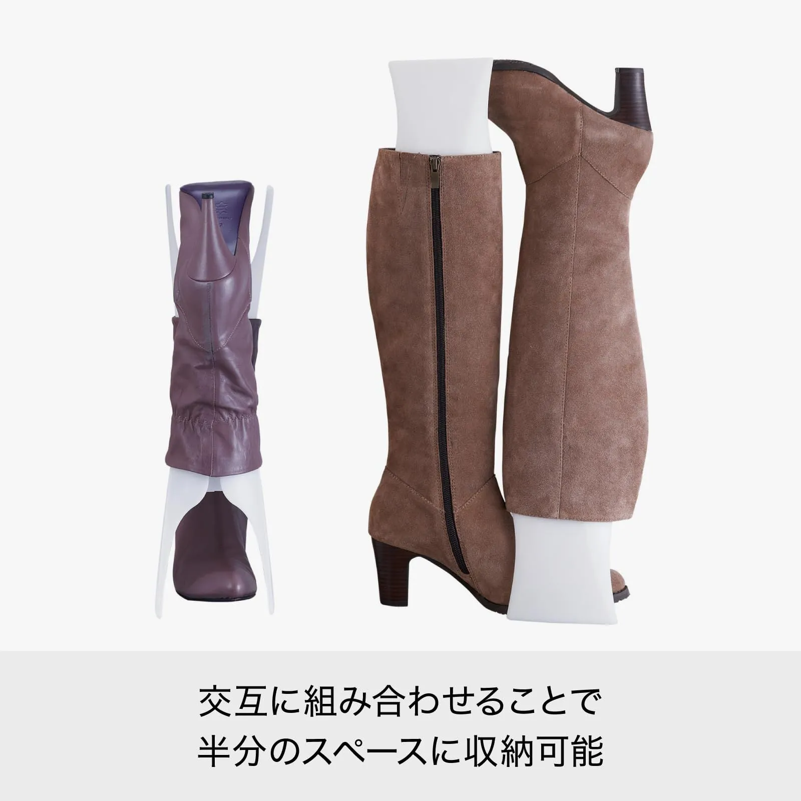 どんなブーツもコンパクトに収納できるブーツホルダー。 ミドルサイズからロングサイズまで対応できる、伸縮機能付き。 ブーツのコンディションを整えながら、2倍の収納量を実現する事が可能。