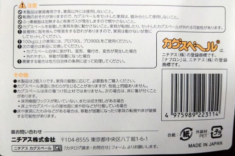 ニチアス カグスベール 重量用 2個入 1パック 家具がらくに移動できる 冷蔵庫やベッドなど重い家具の移動に最適です。 希望数量や他の商品との組み合わせがありましたら質問からお気軽にお問い合わせください。 新たに商品ページを作成します。 ショップのすべての商品の上の方に表示されます。 ご購入頂けない場合もご返答は不要です。