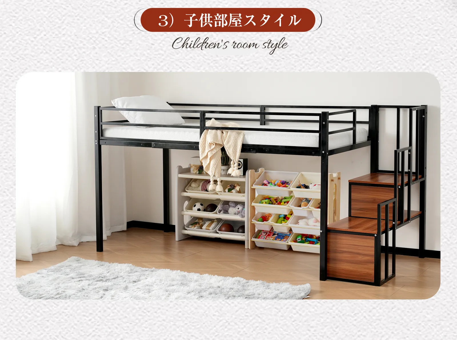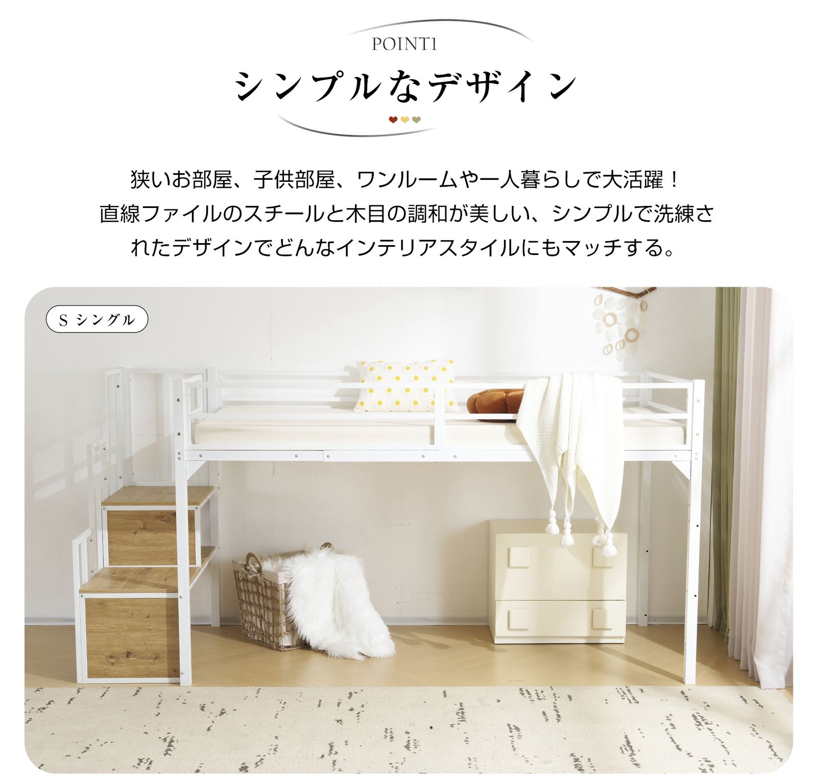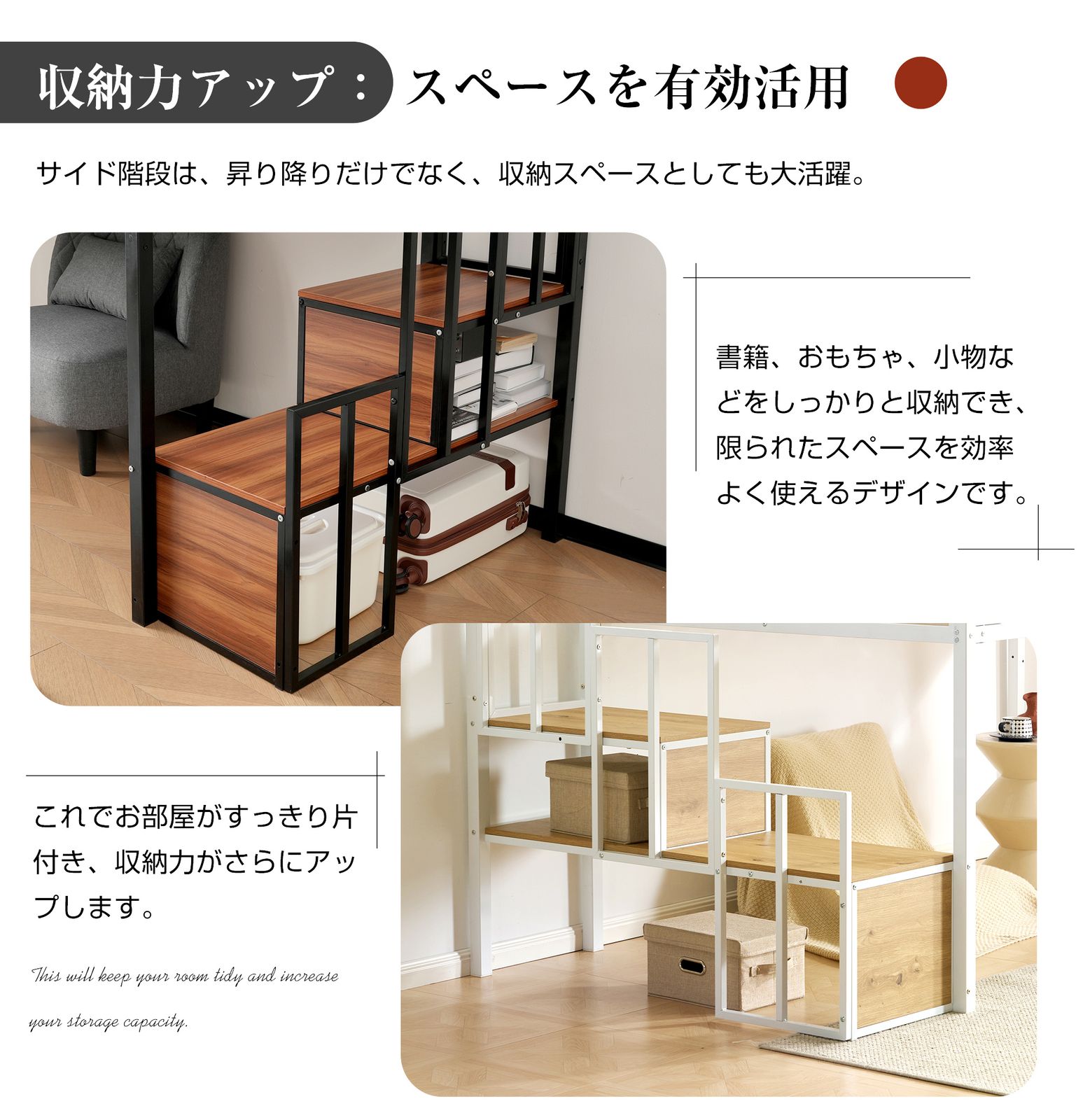 【収納力アップ:スペースを有効活用 】サイド階段は、昇り降りだけでなく、収納スペースとしても大活躍。書籍、おもちゃ、小物などをしっかりと収納でき、限られたスペースを効率よく使えるデザインです。これでお部屋がすっきり片付き、収納力がさらにアップします。