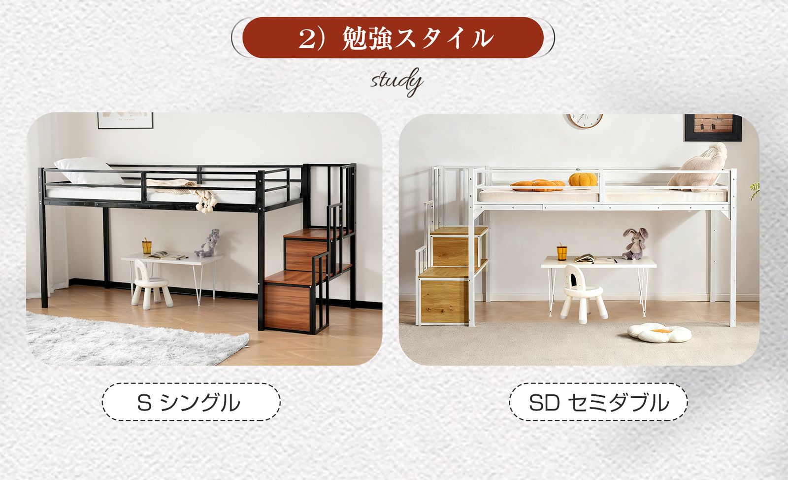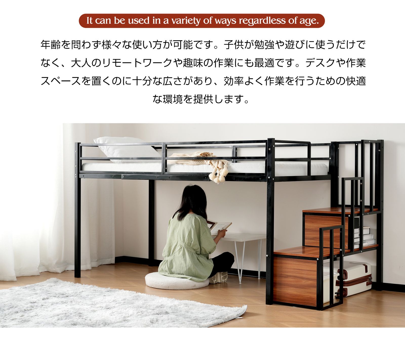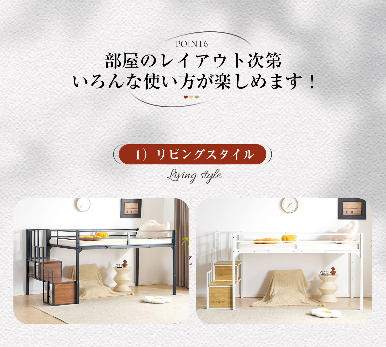【収納力アップ:スペースを有効活用 】サイド階段は、昇り降りだけでなく、収納スペースとしても大活躍。書籍、おもちゃ、小物などをしっかりと収納でき、限られたスペースを効率よく使えるデザインです。これでお部屋がすっきり片付き、収納力がさらにアップします。