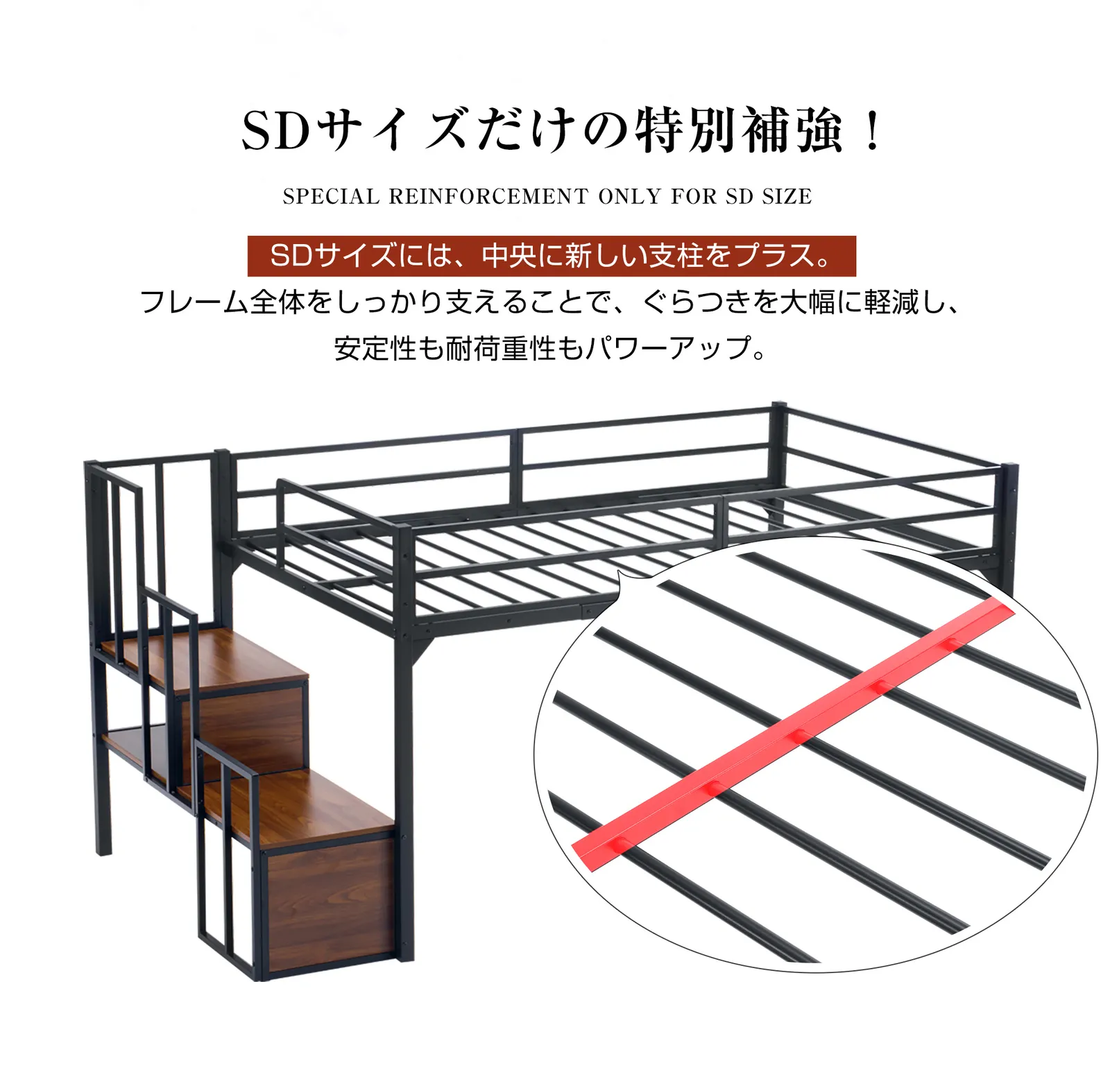 【SDサイズだけの特別補強!】SDサイズには、中央に新しい支柱をプラス。フレーム全体をしっかり支えることで、ぐらつきを大幅に軽減し、安定性も耐荷重性もパワーアップ。