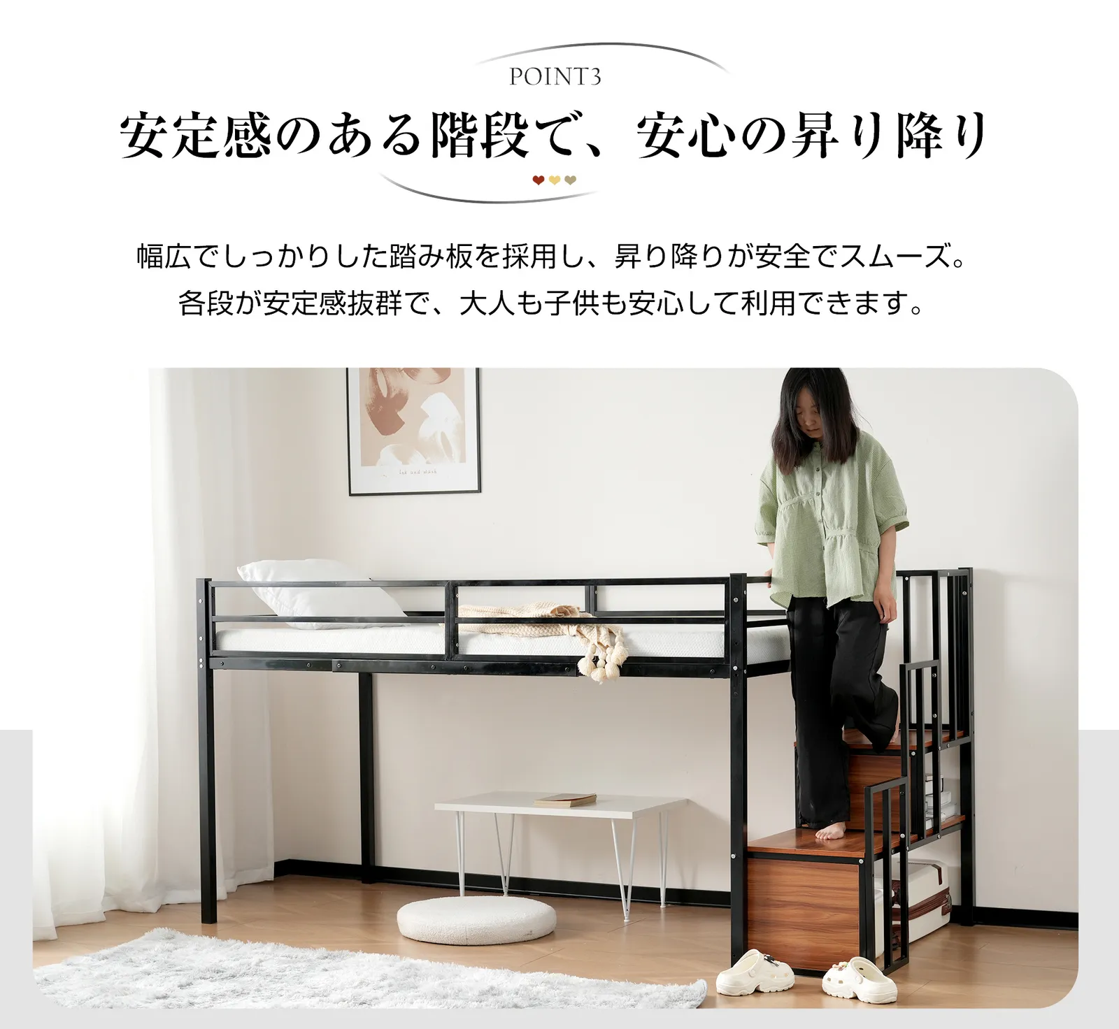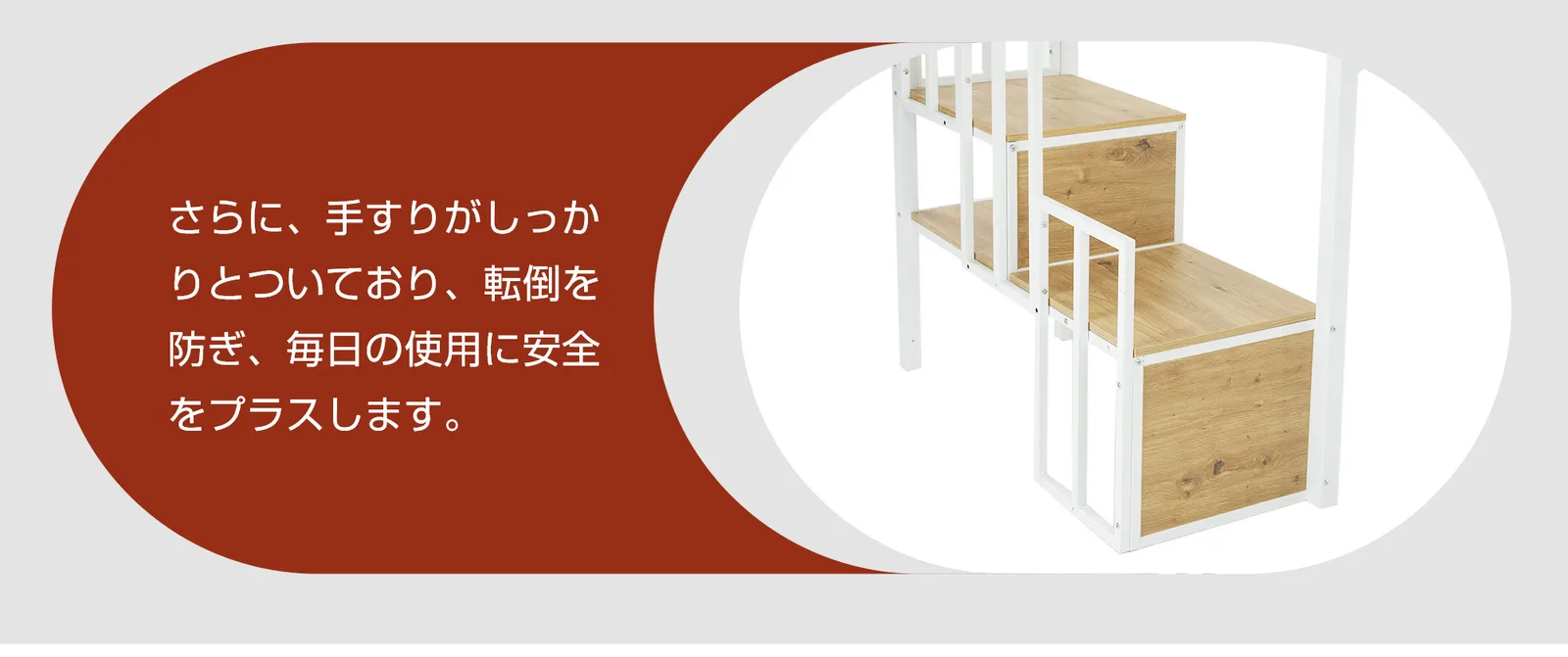 【安定感のある階段で、安心の昇り降り】幅広でしっかりした踏み板を採用し、昇り降りが安全でスムーズ。各段が安定感抜群で、大人も子供も安心して利用できます。さらに、手すりがしっかりとついており、転倒を防ぎ、毎日の使用に安全をプラスします。